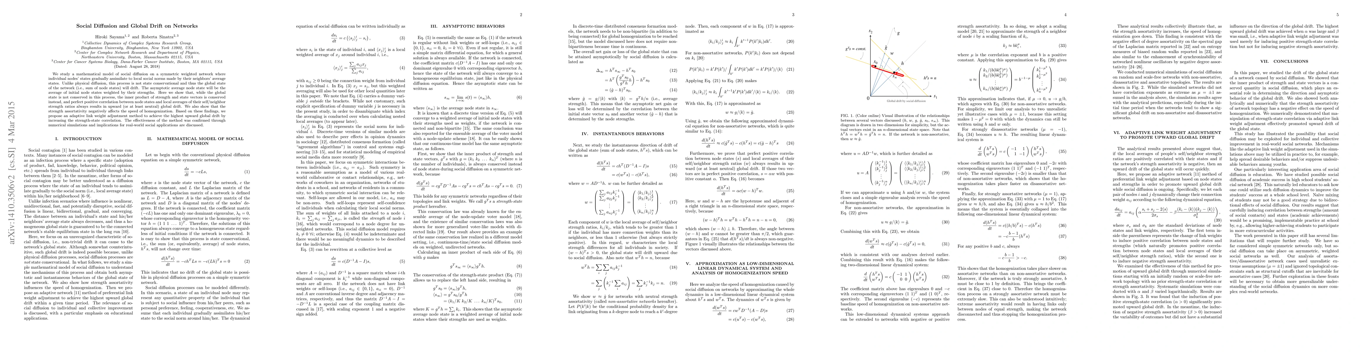 This paper models social diffusion on networks, demonstrating that while the global state drifts due to non-conservational assimilation, the inner product of strength and state vectors remains conserved. It proposes an adaptive link weight adjustment method to enhance upward global drift, validated through simulations, with implications for real-world social dynamics.