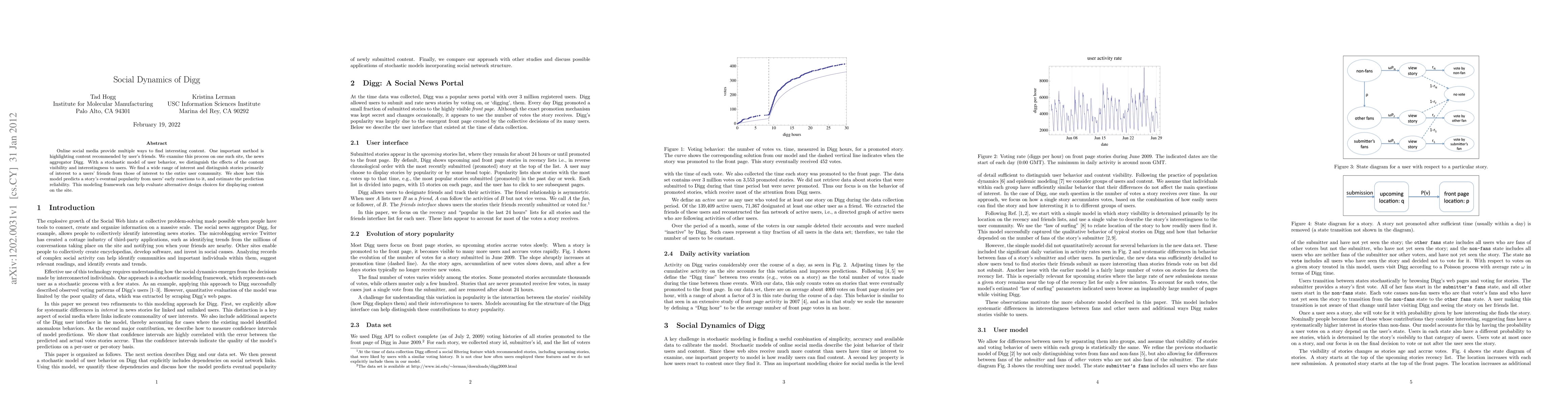 Online social media provide multiple ways to find interesting content. One important method is highlighting content recommended by user's friends. We examine this process on one such site, the news aggregator Digg. With a stochastic model of user behavior, we distinguish the effects of the content visibility and interestingness to users. We find a wide range of interest and distinguish stories primarily of interest to a users' friends from those of interest to the entire user community. We show how this model predicts a story's eventual popularity from users' early reactions to it, and estimate the prediction reliability. This modeling framework can help evaluate alternative design choices for displaying content on the site.