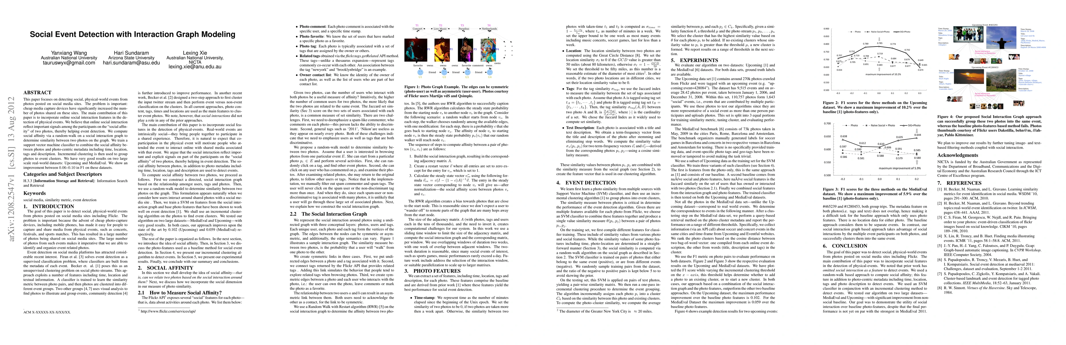 This paper proposes a method to detect social events from social media photos by incorporating online social interaction features. It uses a social interaction graph to compute social affinity, combining this with photo metadata to train a classifier, and improves event detection by 0.06-0.10 in F1 score on large datasets.
