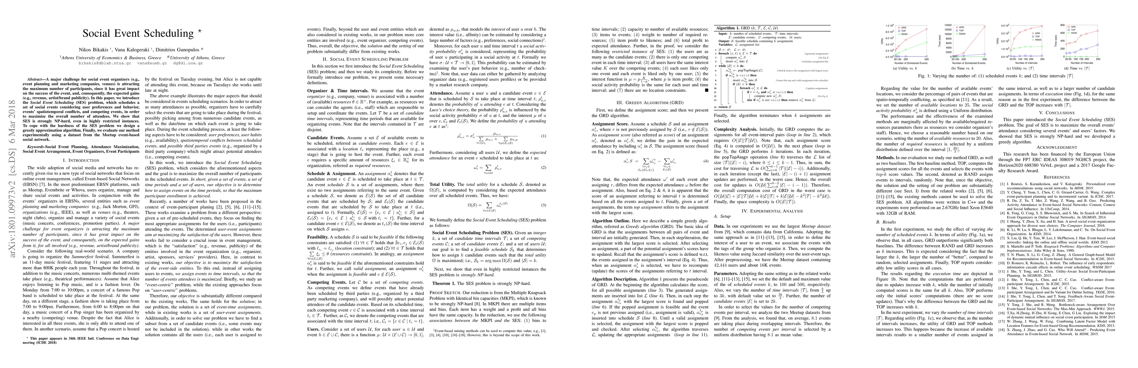 Researchers introduce the Social Event Scheduling problem to maximize attendees at events while considering user preferences, conflicts, and competing venues. They develop a greedy approximation algorithm to solve this challenging NP-hard problem.