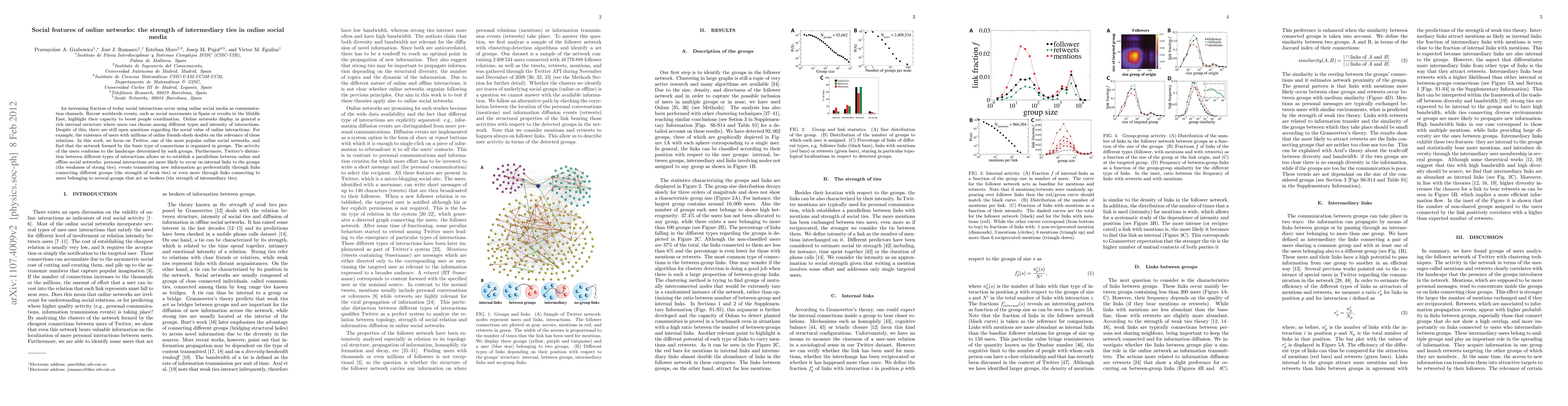 An increasing fraction of today social interactions occur using online social media as communication channels. Recent worldwide events, such as social movements in Spain or revolts in the Middle East, highlight their capacity to boost people coordination. Online networks display in general a rich internal structure where users can choose among different types and intensity of interactions. Despite of this, there are still open questions regarding the social value of online interactions. For example, the existence of users with millions of online friends sheds doubts on the relevance of these relations. In this work, we focus on Twitter, one of the most popular online social networks, and find that the network formed by the basic type of connections is organized in groups. The activity of the users conforms to the landscape determined by such groups. Furthermore, Twitter's distinction between different types of interactions allows us to establish a parallelism between online and offline social networks: personal interactions are more likely to occur on internal links to the groups (the weakness of strong ties), events transmitting new information go preferentially through links connecting different groups (the strength of weak ties) or even more through links connecting to users belonging to several groups that act as brokers (the strength of intermediary ties).