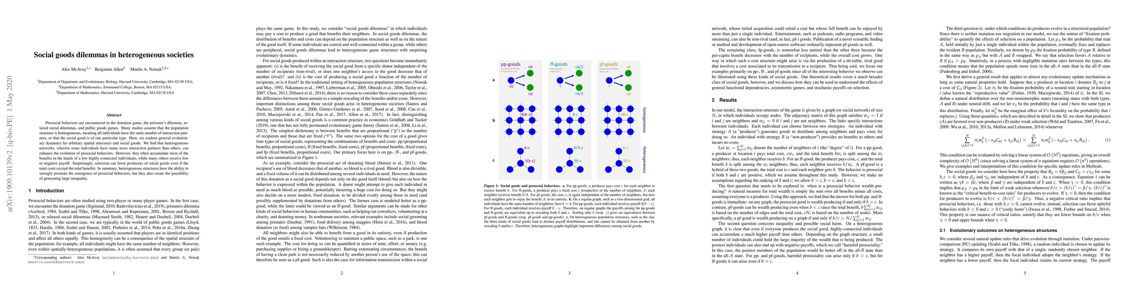 The research explores how varying population structures and social good types influence prosocial behaviors. It finds that heterogeneous networks, characterized by unequal interaction partners, can foster prosocial actions but also result in significant inequality, with benefits often concentrated among highly-connected individuals. Surprisingly, the study reveals that prosocial behavior can evolve even when costs outweigh benefits.