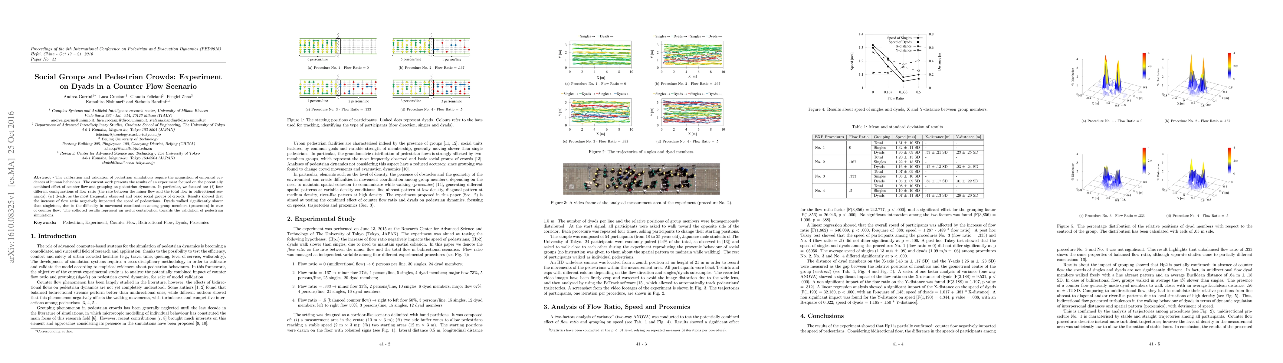 This study investigates the impact of counter flow and social group dynamics on pedestrian speed, focusing on dyads. Results indicate that higher flow ratios reduce pedestrian speed, with dyads moving significantly slower than singletons due to coordination challenges. The findings contribute to the validation of pedestrian simulation models.