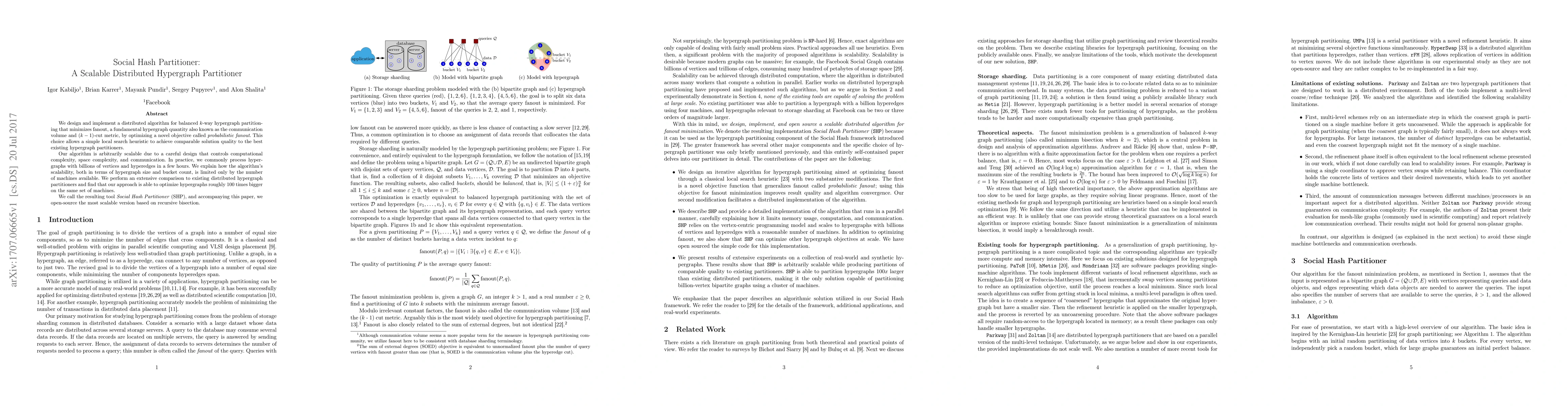 The Social Hash Partitioner (SHP) is a scalable distributed algorithm for balanced $k$-way hypergraph partitioning that minimizes fanout through a probabilistic objective, achieving comparable quality to existing partitioners. SHP's design optimizes computational, space, and communication complexities, enabling it to handle hypergraphs with billions of vertices and hyperedges efficiently.
