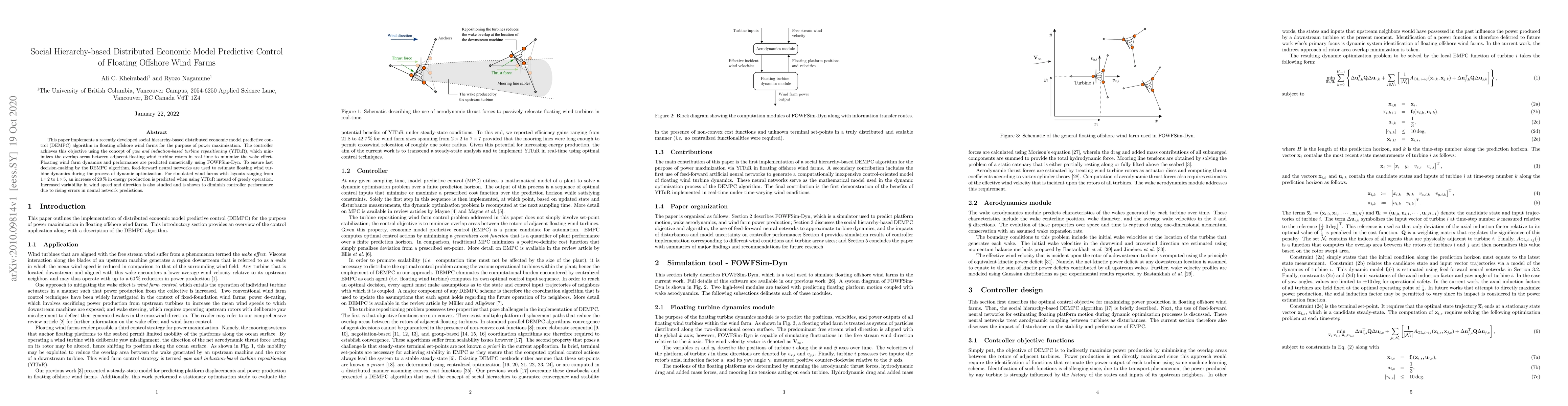 This paper proposes a social hierarchy-based distributed economic model predictive control (DEMPC) for floating offshore wind farms, utilizing yaw and induction-based turbine repositioning (YITuR) to maximize power output by minimizing wake effects. Simulation results show a 20% increase in energy production compared to greedy operation, though performance declines with increased wind variability.