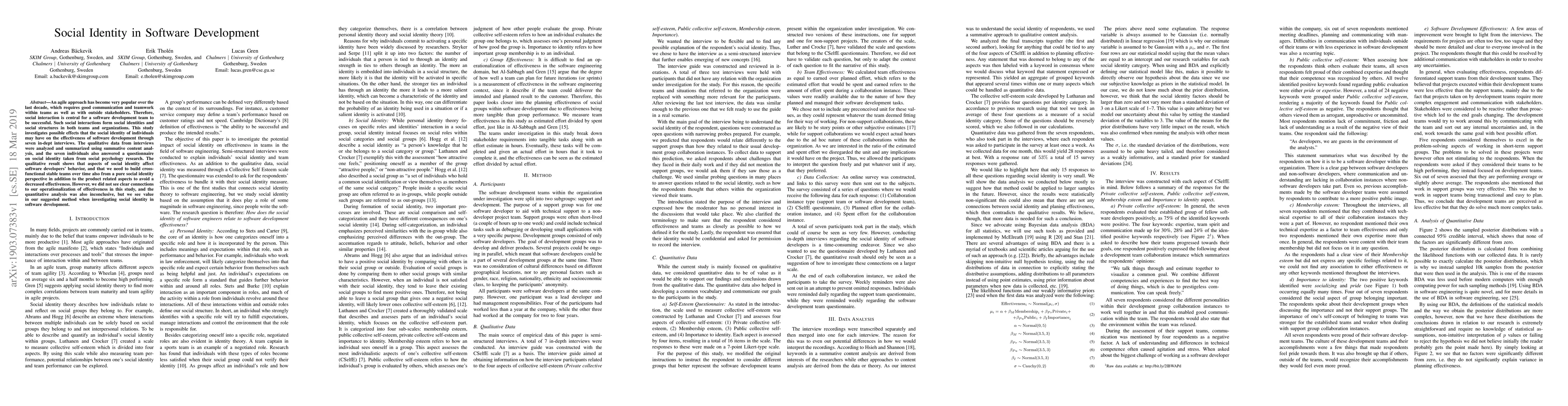 This study explores how social identity influences software development effectiveness through qualitative interviews and a questionnaire. Findings suggest that social identity affects developers' behavior and recommends forming stable cross-functional teams to maintain effectiveness, though the study's operationalization of effectiveness remains unclear.