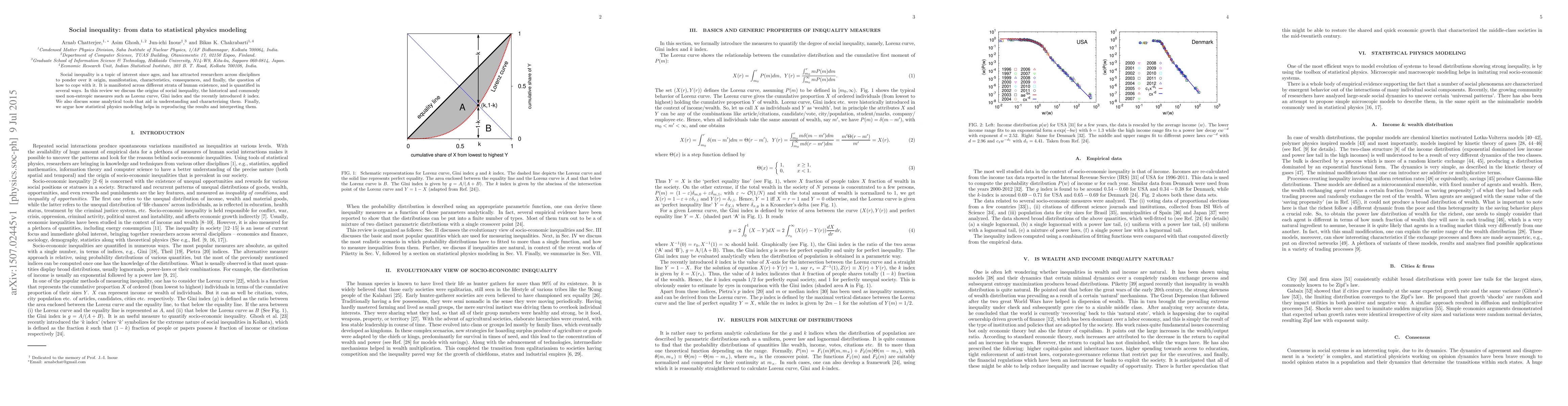 This paper reviews the origins and quantification of social inequality using historical measures like the Lorenz curve and Gini index, and introduces the $k$ index. It highlights how statistical physics modeling aids in interpreting and reproducing these results.