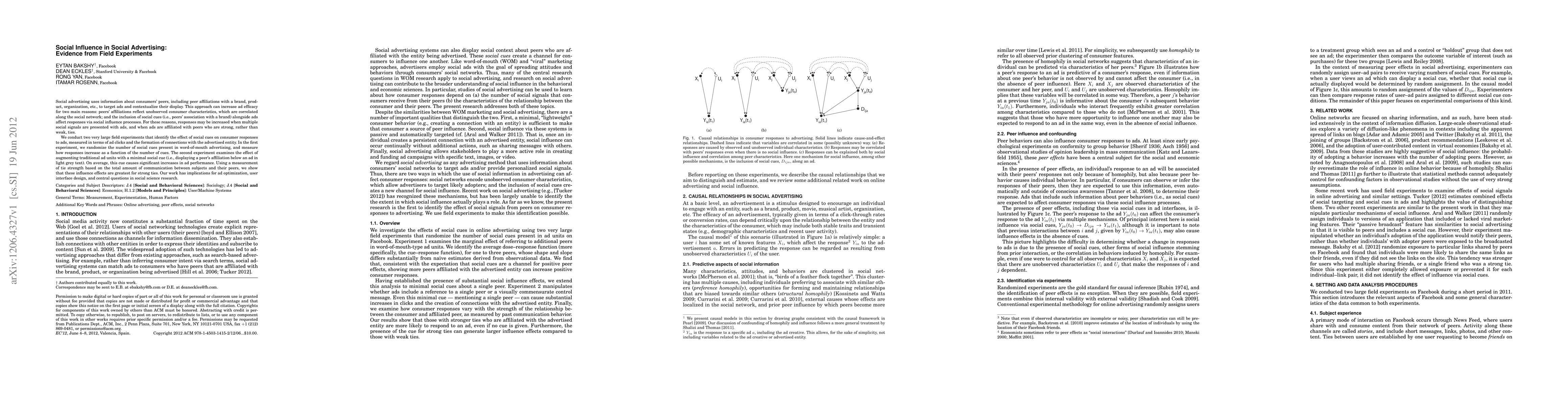 This research demonstrates that social advertising, using peers' affiliations, significantly boosts ad efficacy via social influence. Two large-scale experiments reveal ad performance increases with more social cues and stronger ties, impacting ad clicks and user connections. Implications are drawn for ad optimization, UI design, and social science research.