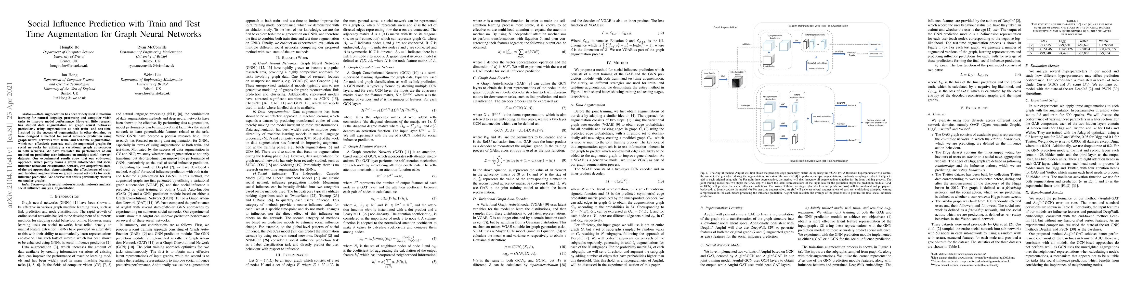 Data augmentation has been widely used in machine learning for natural language processing and computer vision tasks to improve model performance. However, little research has studied data augmentation on graph neural networks, particularly using augmentation at both train- and test-time. Inspired by the success of augmentation in other domains, we have designed a method for social influence prediction using graph neural networks with train- and test-time augmentation, which can effectively generate multiple augmented graphs for social networks by utilising a variational graph autoencoder in both scenarios. We have evaluated the performance of our method on predicting user influence on multiple social network datasets. Our experimental results show that our end-to-end approach, which jointly trains a graph autoencoder and social influence behaviour classification network, can outperform state-of-the-art approaches, demonstrating the effectiveness of train- and test-time augmentation on graph neural networks for social influence prediction. We observe that this is particularly effective on smaller graphs.