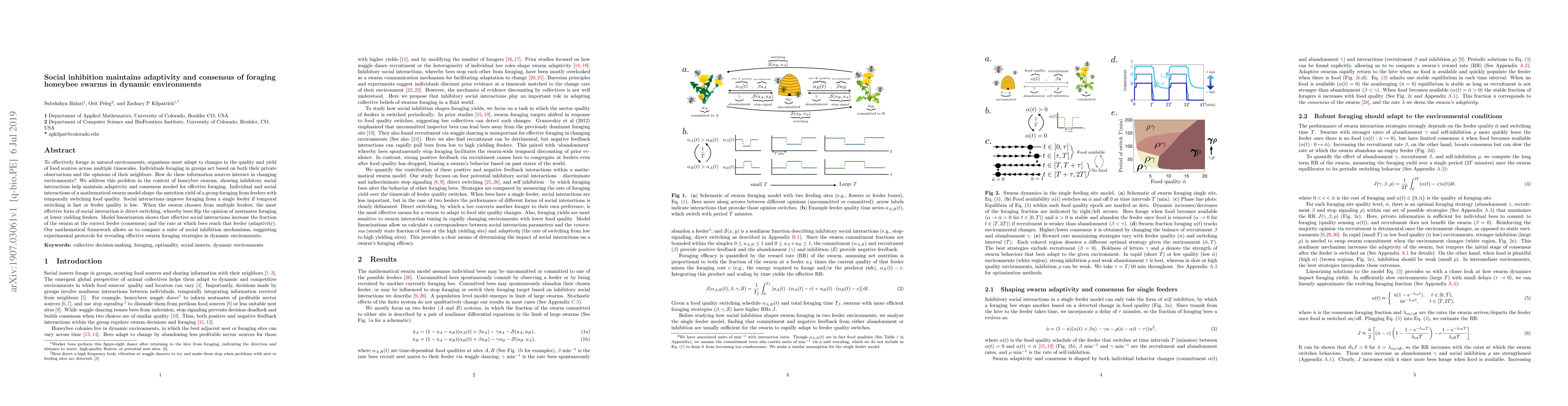 This study investigates how social inhibition in honeybee swarms enhances adaptivity and consensus during foraging in dynamic environments. The research demonstrates that inhibitory social interactions improve foraging efficiency, particularly when food quality changes rapidly or is low, and suggest effective strategies for future experimental studies.