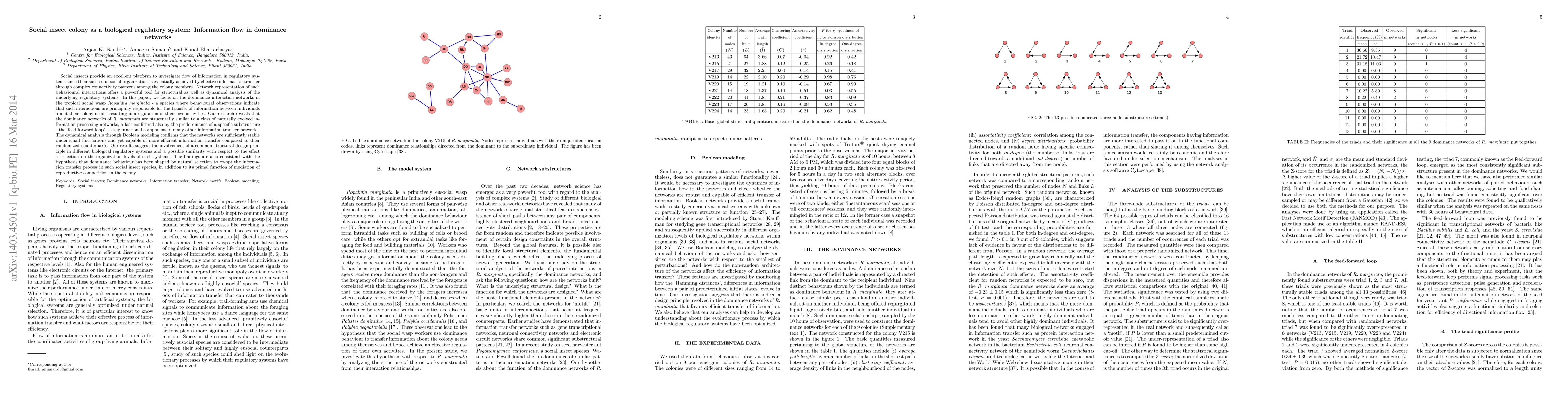 Social insects provide an excellent platform to investigate flow of information in regulatory systems since their successful social organization is essentially achieved by effective information transfer through complex connectivity patterns among the colony members. Network representation of such behavioural interactions offers a powerful tool for structural as well as dynamical analysis of the underlying regulatory systems. In this paper, we focus on the dominance interaction networks in the tropical social wasp \textit{Ropalidia marginata} - a species where behavioural observations indicate that such interactions are principally responsible for the transfer of information between individuals about their colony needs, resulting in a regulation of their own activities. Our research reveals that the dominance networks of \textit{R. marginata} are structurally similar to a class of naturally evolved information processing networks, a fact confirmed also by the predominance of a specific substructure - the `feed-forward loop' - a key functional component in many other information transfer networks. The dynamical analysis through Boolean modeling confirms that the networks are sufficiently stable under small fluctuations and yet capable of more efficient information transfer compared to their randomized counterparts. Our results suggest the involvement of a common structural design principle in different biological regulatory systems and a possible similarity with respect to the effect of selection on the organization levels of such systems. The findings are also consistent with the hypothesis that dominance behaviour has been shaped by natural selection to co-opt the information transfer process in such social insect species, in addition to its primal function of mediation of reproductive competition in the colony.