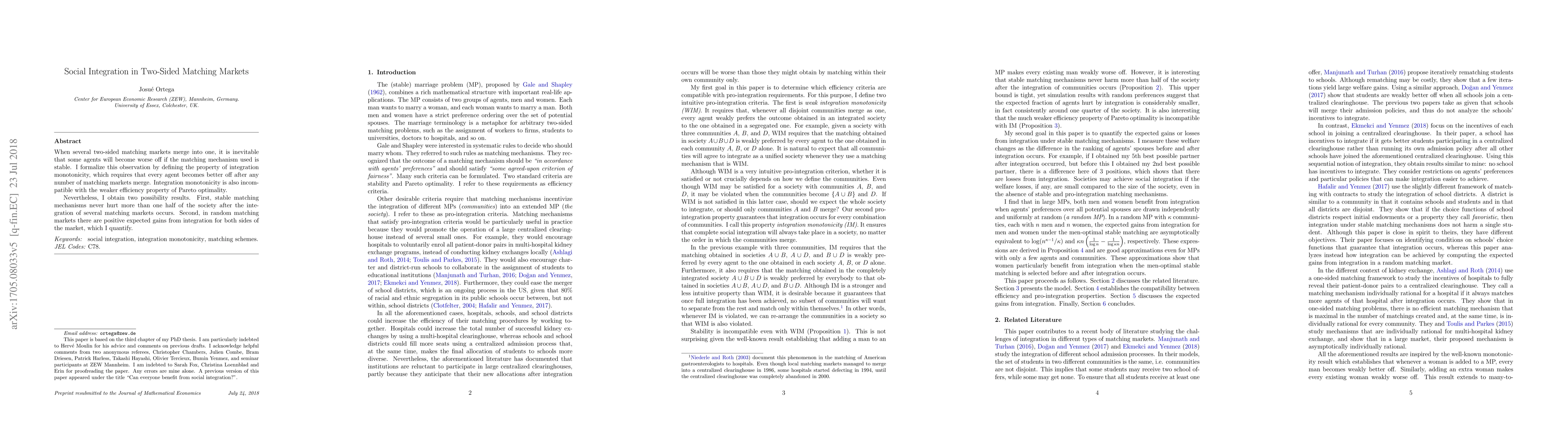 The paper introduces the property of integration monotonicity and proves impossibility results concerning the simultaneous satisfaction of stability, Pareto optimality, and integration monotonicity in two-sided matching markets.