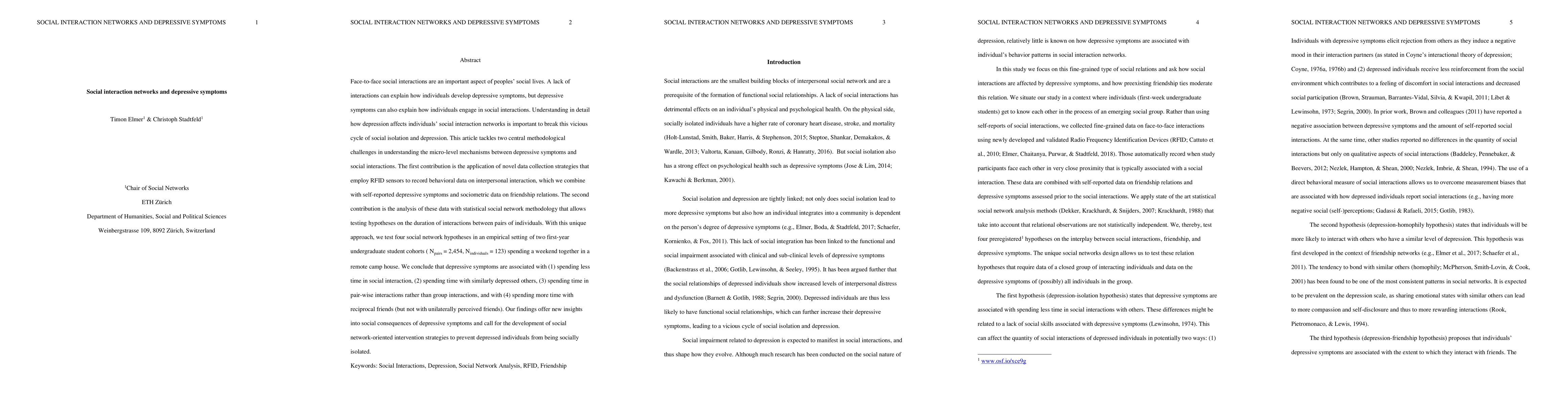 This study employs RFID sensors and social network analysis to investigate the relationship between depressive symptoms and social interaction networks among first-year undergraduates. Findings reveal that depressive symptoms correlate with reduced interaction time, preference for similarly depressed peers, and a tendency for pair-wise rather than group interactions. The research underscores the need for social network-oriented interventions to combat social isolation in depressed individuals.