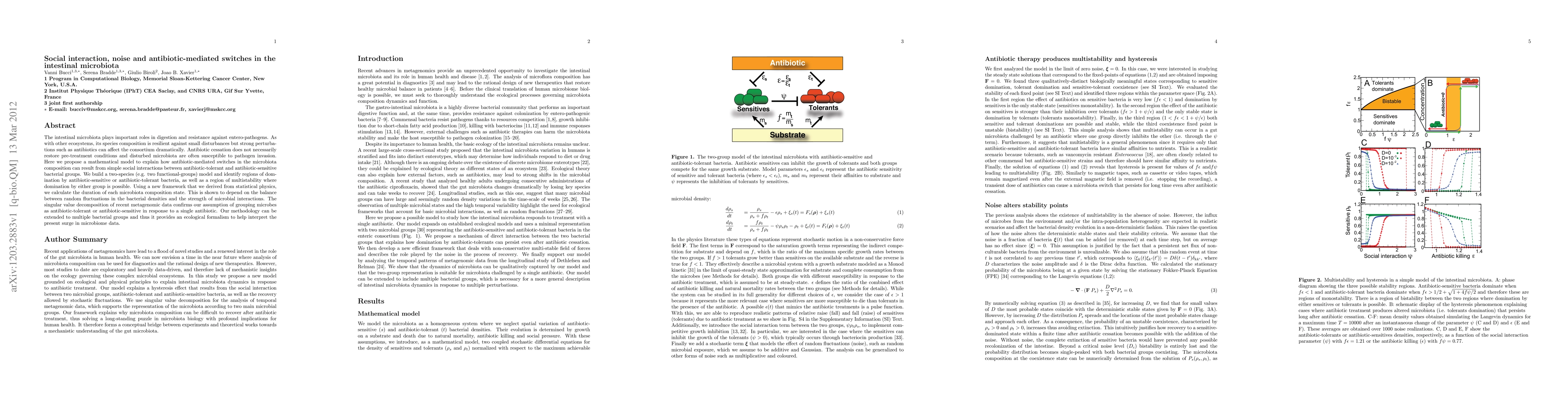 The intestinal microbiota plays important roles in digestion and resistance against entero-pathogens. As with other ecosystems, its species composition is resilient against small disturbances but strong perturbations such as antibiotics can affect the consortium dramatically. Antibiotic cessation does not necessarily restore pre-treatment conditions and disturbed microbiota are often susceptible to pathogen invasion. Here we propose a mathematical model to explain how antibiotic-mediated switches in the microbiota composition can result from simple social interactions between antibiotic-tolerant and antibiotic-sensitive bacterial groups. We build a two-species (e.g. two functional-groups) model and identify regions of domination by antibiotic-sensitive or antibiotic-tolerant bacteria, as well as a region of multistability where domination by either group is possible. Using a new framework that we derived from statistical physics, we calculate the duration of each microbiota composition state. This is shown to depend on the balance between random fluctuations in the bacterial densities and the strength of microbial interactions. The singular value decomposition of recent metagenomic data confirms our assumption of grouping microbes as antibiotic-tolerant or antibiotic-sensitive in response to a single antibiotic. Our methodology can be extended to multiple bacterial groups and thus it provides an ecological formalism to help interpret the present surge in microbiome data.