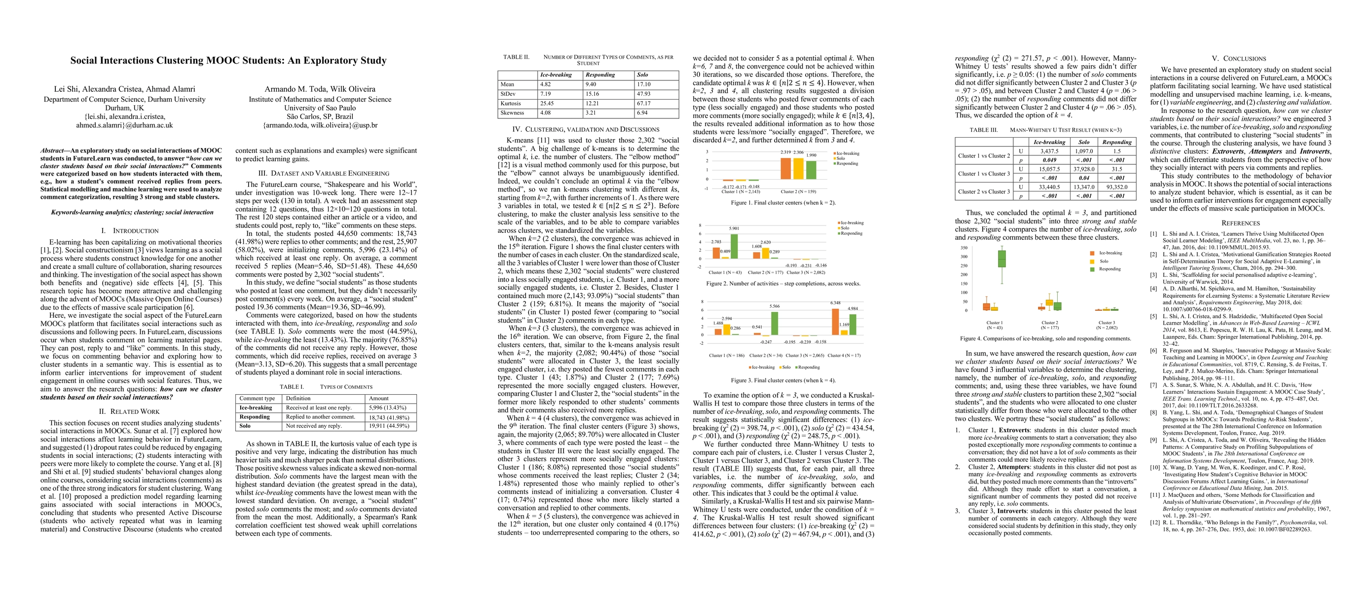 An exploratory study on social interactions of MOOC students in FutureLearn was conducted, to answer "how can we cluster students based on their social interactions?" Comments were categorized based on how students interacted with them, e.g., how a student's comment received replies from peers. Statistical modelling and machine learning were used to analyze comment categorization, resulting in 3 strong and stable clusters.