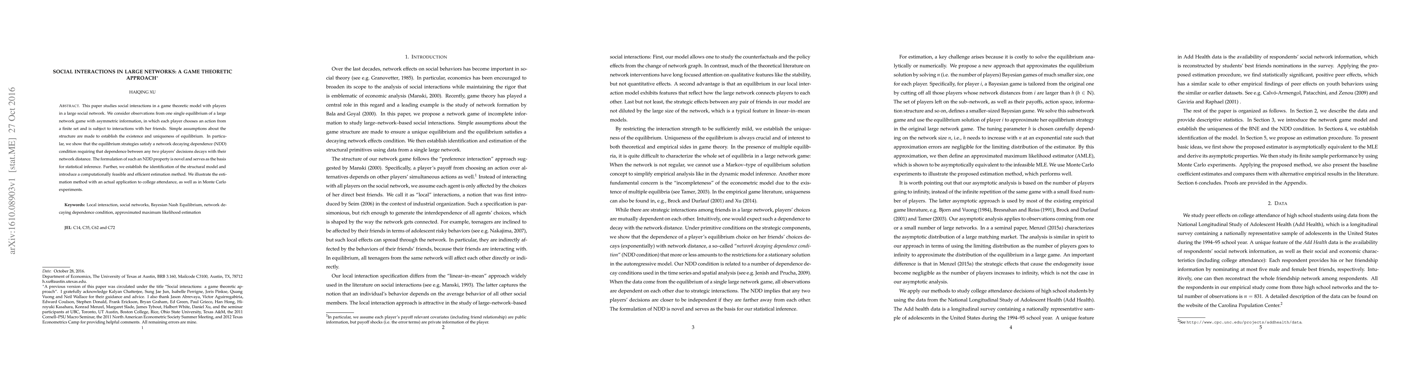 This paper employs a game theoretic model to analyze social interactions in large networks, establishing the existence and uniqueness of equilibrium under asymmetric information. It introduces a novel network decaying dependence (NDD) condition and proposes a computationally feasible estimation method, demonstrating its application in college attendance data and Monte Carlo simulations.