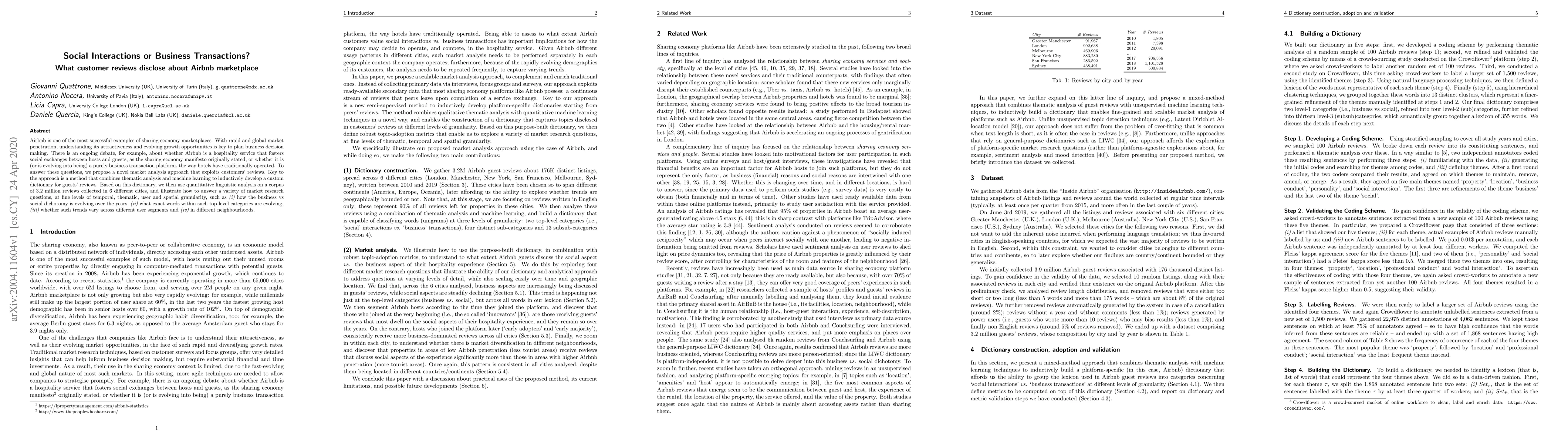 This paper analyzes Airbnb customer reviews to determine if the platform functions as a social exchange or a business transaction. It employs a combination of thematic analysis and machine learning to develop a custom dictionary, followed by quantitative linguistic analysis on 3.2 million reviews, revealing insights into the evolving nature of Airbnb interactions over time, across different user segments, and neighborhoods.