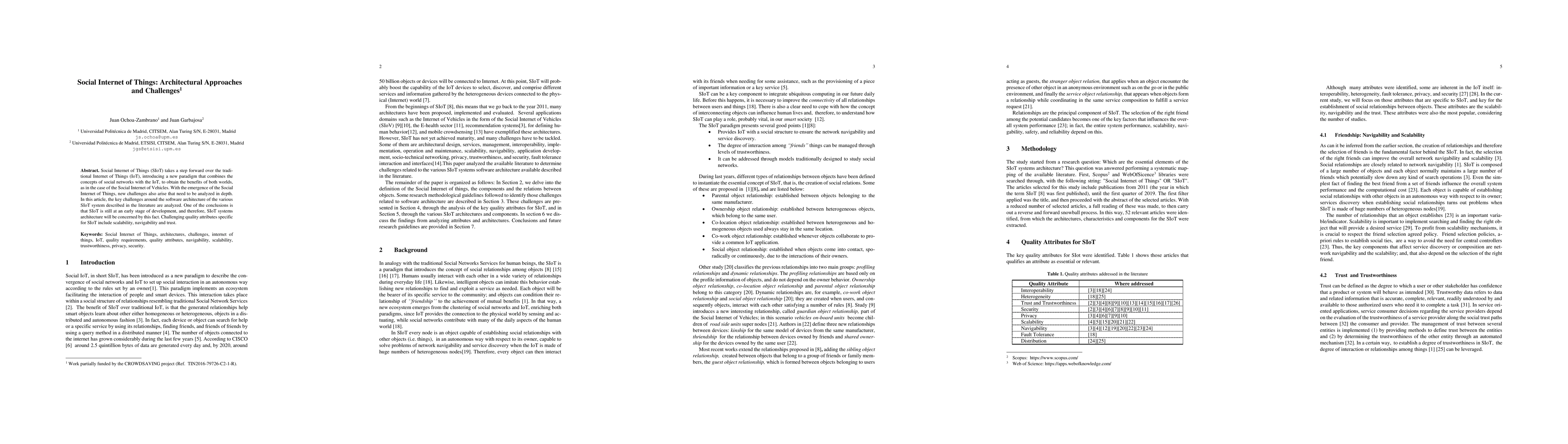 Summary: The paper explores the Social Internet of Things (SIoT), a fusion of social networks and IoT, highlighting its potential benefits and the new challenges it presents. It focuses on the architectural challenges, particularly scalability, navigability, and trust, and concludes that SIoT is still in its developmental infancy, which complicates its system architecture.