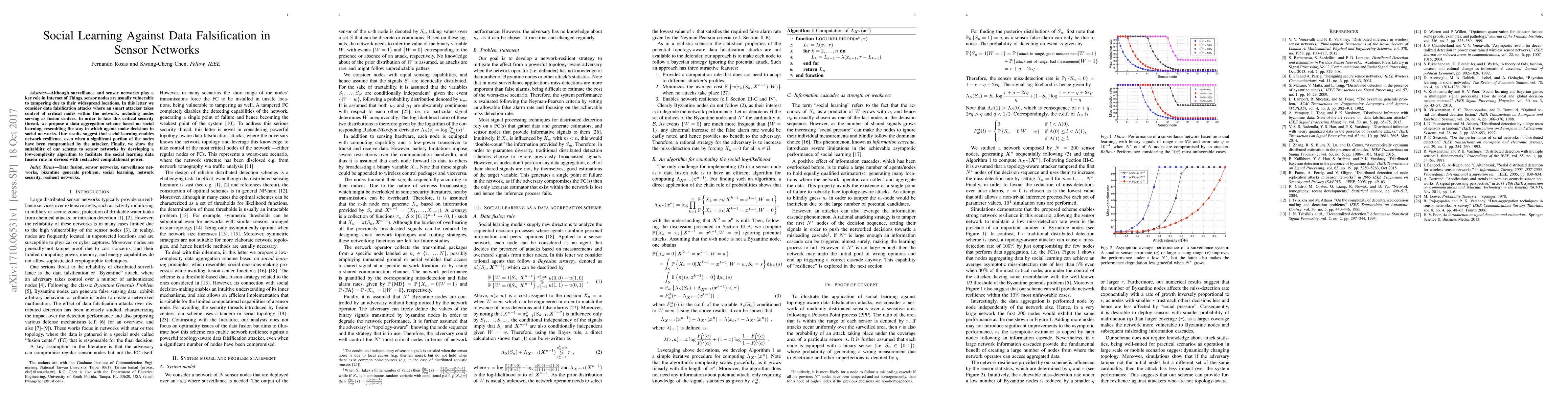 Although surveillance and sensor networks play a key role in Internet of Things, sensor nodes are usually vulnerable to tampering due to their widespread locations. In this letter we consider data falsification attacks where an smart attacker takes control of critical nodes within the network, including nodes serving as fusion centers. In order to face this critical security thread, we propose a data aggregation scheme based on social learning, resembling the way in which agents make decisions in social networks. Our results suggest that social learning enables network resilience, even when a significant portion of the nodes have been compromised by the attacker. Finally, we show the suitability of our scheme to sensor networks by developing a low-complexity algorithm to facilitate the social learning data fusion rule in devices with restricted computational power.