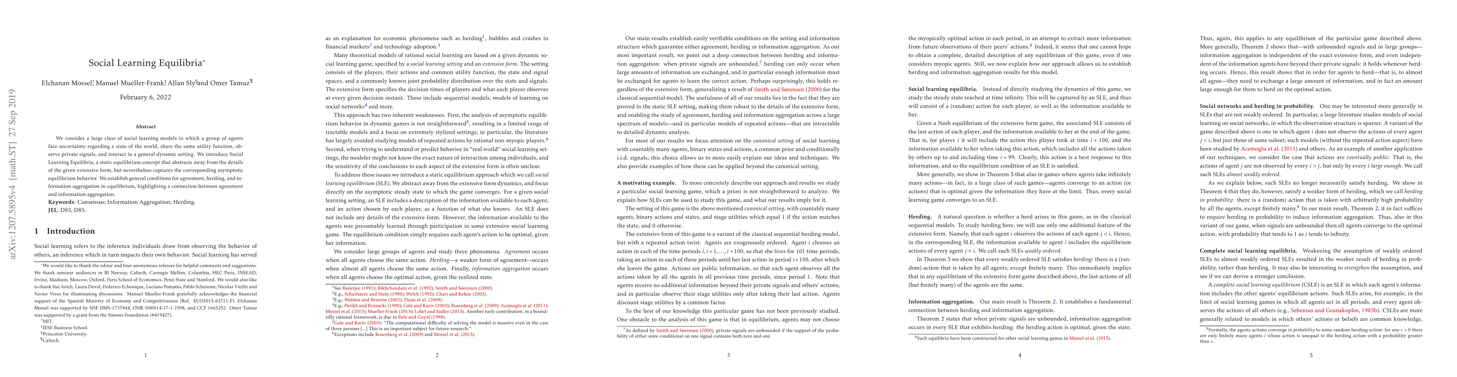 This paper introduces Social Learning Equilibria, a concept that captures asymptotic behavior in social learning models with uncertain states, shared utility functions, and private signals. It establishes conditions for agreement, herding, and information aggregation in equilibrium, highlighting the connection between these phenomena.