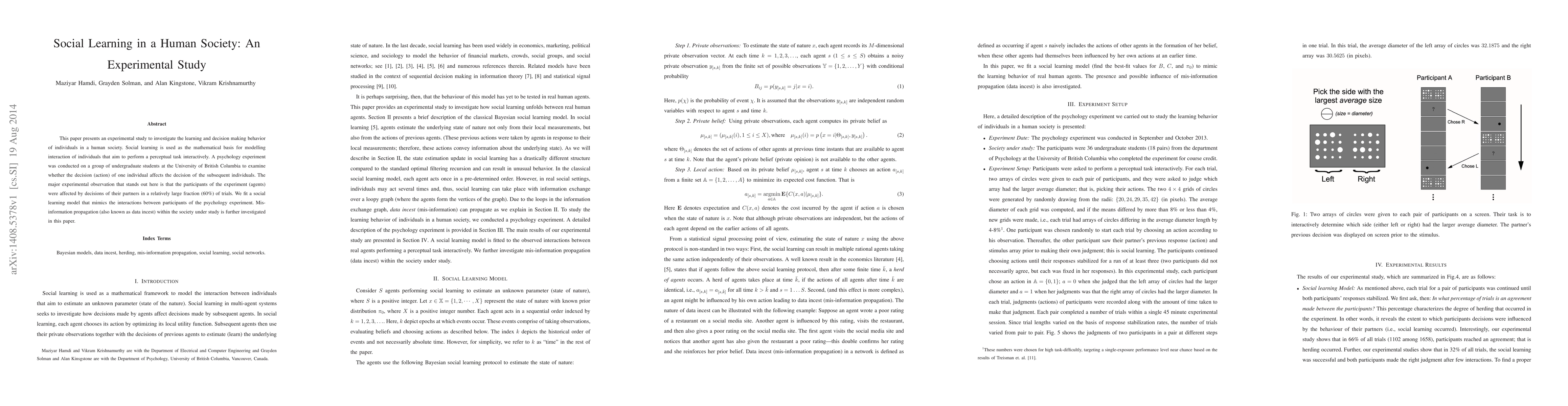 This paper presents an experimental study to investigate the learning and decision making behavior of individuals in a human society. Social learning is used as the mathematical basis for modelling interaction of individuals that aim to perform a perceptual task interactively. A psychology experiment was conducted on a group of undergraduate students at the University of British Columbia to examine whether the decision (action) of one individual affects the decision of the subsequent individuals. The major experimental observation that stands out here is that the participants of the experiment (agents) were affected by decisions of their partners in a relatively large fraction (60%) of trials. We fit a social learning model that mimics the interactions between participants of the psychology experiment. Misinformation propagation (also known as data incest) within the society under study is further investigated in this paper.