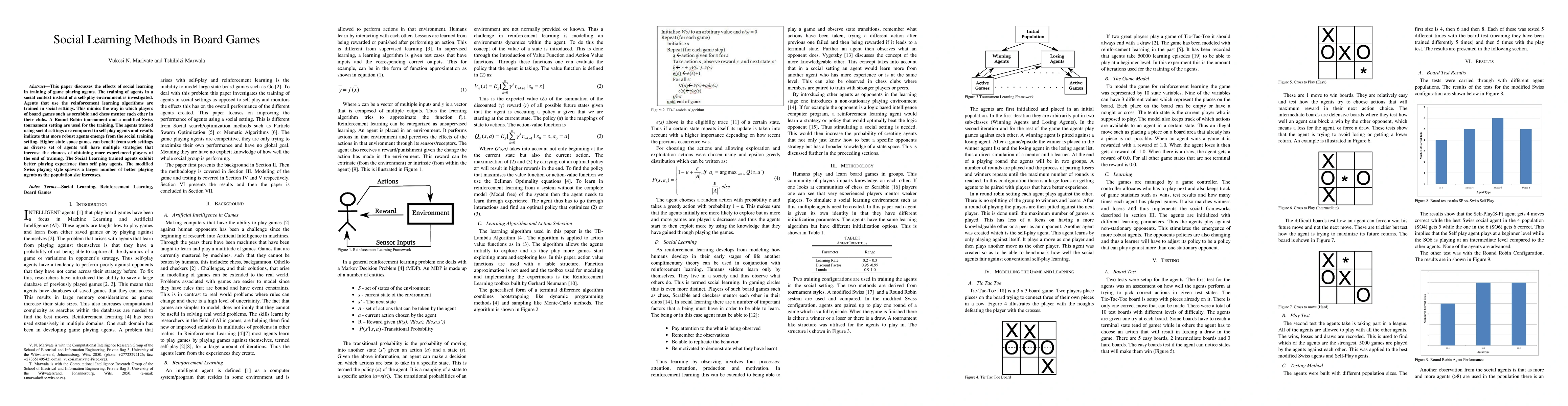 This paper discusses the effects of social learning in training of game playing agents. The training of agents in a social context instead of a self-play environment is investigated. Agents that use the reinforcement learning algorithms are trained in social settings. This mimics the way in which players of board games such as scrabble and chess mentor each other in their clubs. A Round Robin tournament and a modified Swiss tournament setting are used for the training. The agents trained using social settings are compared to self play agents and results indicate that more robust agents emerge from the social training setting. Higher state space games can benefit from such settings as diverse set of agents will have multiple strategies that increase the chances of obtaining more experienced players at the end of training. The Social Learning trained agents exhibit better playing experience than self play agents. The modified Swiss playing style spawns a larger number of better playing agents as the population size increases.