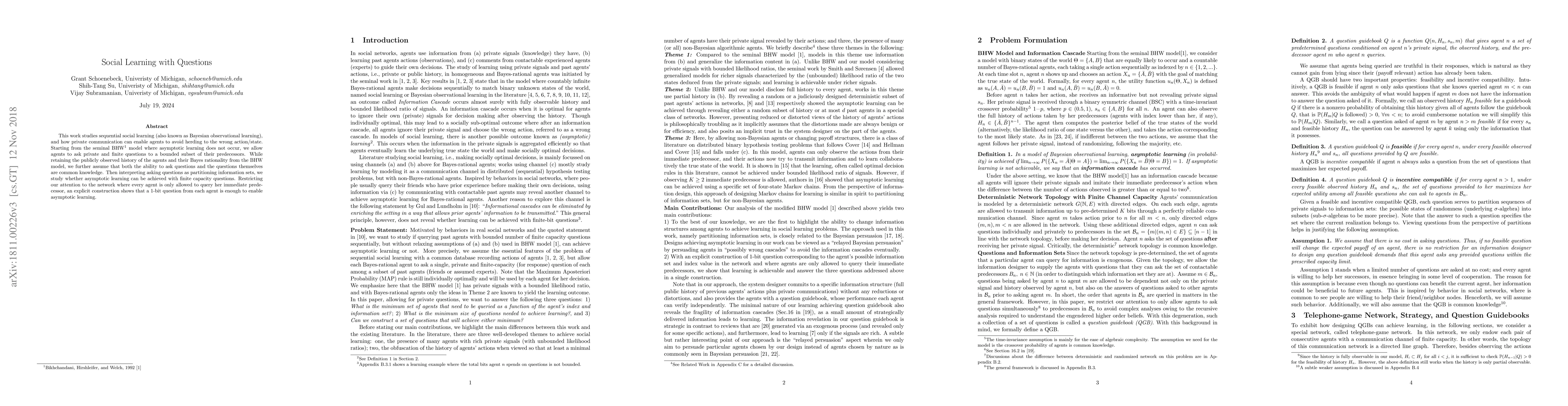 This work studies sequential social learning (also known as Bayesian observational learning), and how private communication can enable agents to avoid herding to the wrong action/state. Starting from the seminal BHW (Bikhchandani, Hirshleifer, and Welch, 1992) model where asymptotic learning does not occur, we allow agents to ask private and finite questions to a bounded subset of their predecessors. While retaining the publicly observed history of the agents and their Bayes rationality from the BHW model, we further assume that both the ability to ask questions and the questions themselves are common knowledge. Then interpreting asking questions as partitioning information sets, we study whether asymptotic learning can be achieved with finite capacity questions. Restricting our attention to the network where every agent is only allowed to query her immediate predecessor, an explicit construction shows that a 1-bit question from each agent is enough to enable asymptotic learning.