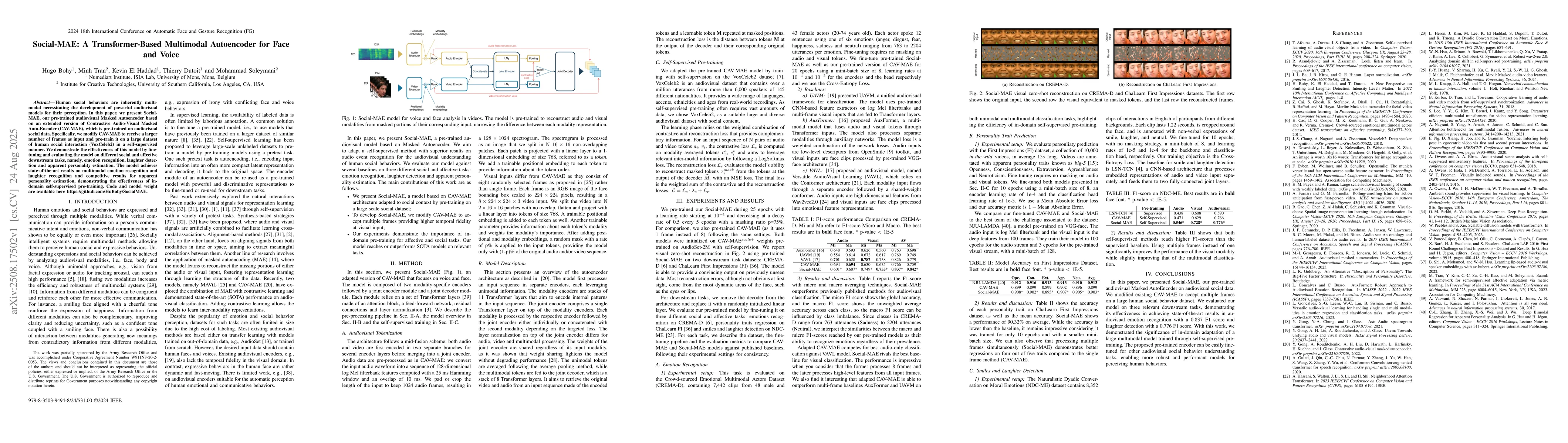 Human social behaviors are inherently multimodal necessitating the development of powerful audiovisual models for their perception. In this paper, we present Social-MAE, our pre-trained audiovisual Masked Autoencoder based on an extended version of Contrastive Audio-Visual Masked Auto-Encoder (CAV-MAE), which is pre-trained on audiovisual social data. Specifically, we modify CAV-MAE to receive a larger number of frames as input and pre-train it on a large dataset of human social interaction (VoxCeleb2) in a self-supervised manner. We demonstrate the effectiveness of this model by finetuning and evaluating the model on different social and affective downstream tasks, namely, emotion recognition, laughter detection and apparent personality estimation. The model achieves state-of-the-art results on multimodal emotion recognition and laughter recognition and competitive results for apparent personality estimation, demonstrating the effectiveness of in-domain self-supervised pre-training. Code and model weight are available here https://github.com/HuBohy/SocialMAE.