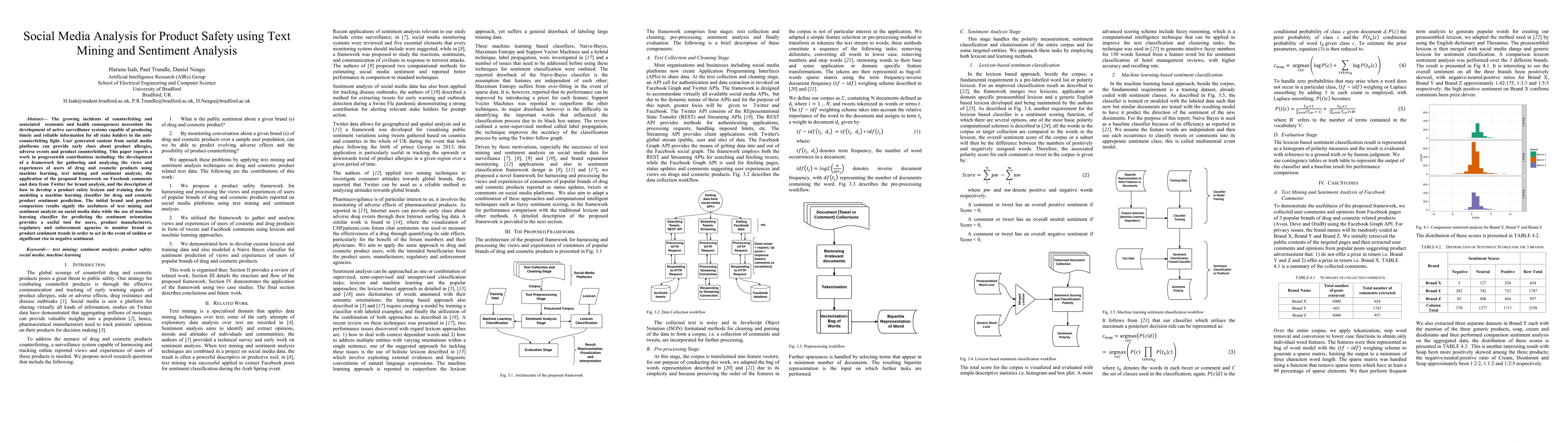 This paper develops a framework using text mining and sentiment analysis to monitor social media for drug and cosmetic product safety, employing machine learning on Facebook and Twitter data to identify counterfeiting and adverse events. Initial results show the potential for early detection and trend monitoring by stakeholders.