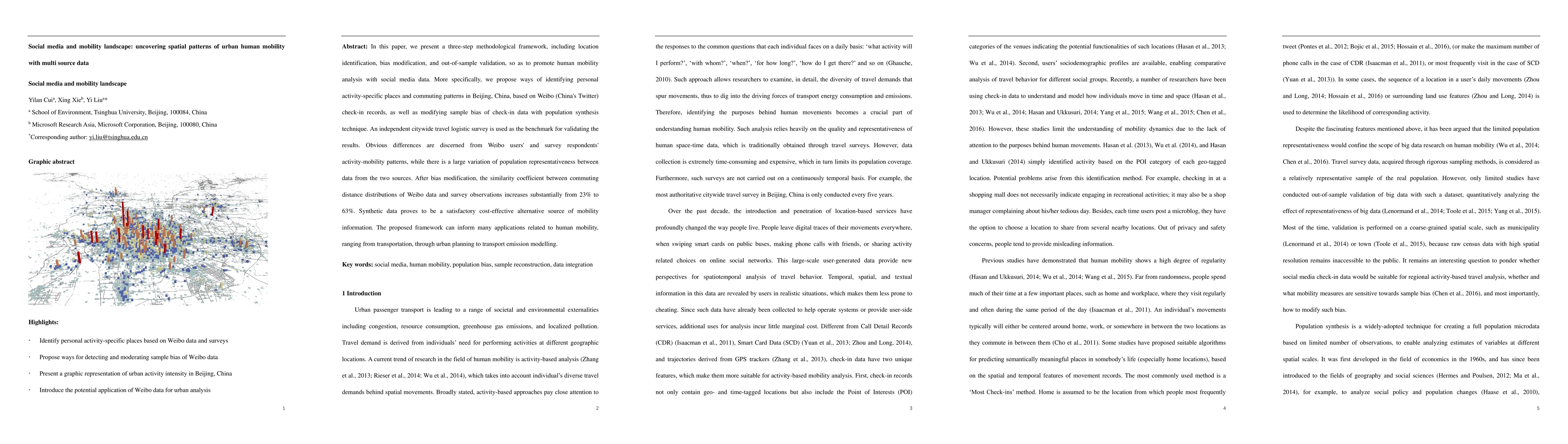 This paper develops a methodological framework to analyze urban human mobility using social media data, specifically Weibo check-ins in Beijing. After bias modification, the similarity between modified Weibo data and survey observations significantly increases, demonstrating the potential of synthetic data for mobility studies.