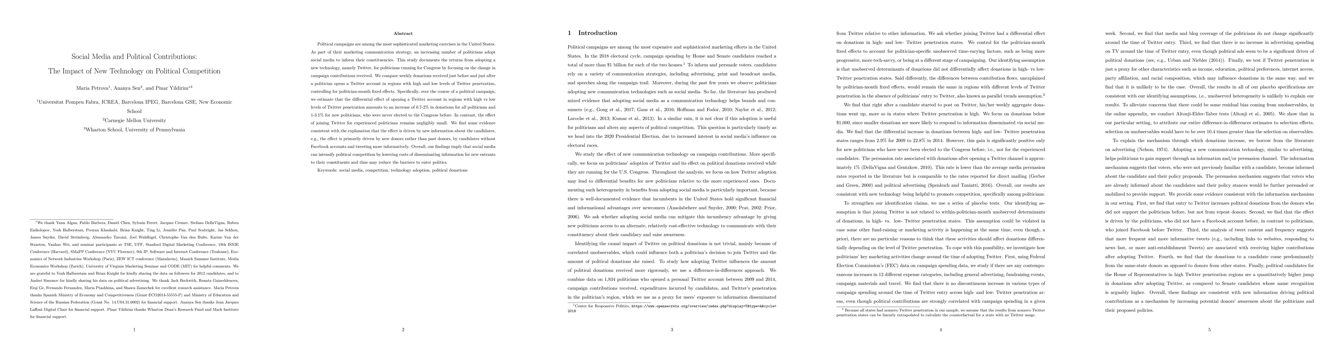 Political campaigns are among the most sophisticated marketing exercises in the United States. As part of their marketing communication strategy, an increasing number of politicians adopt social media to inform their constituencies. This study documents the returns from adopting a new technology, namely Twitter, for politicians running for Congress by focusing on the change in campaign contributions received. We compare weekly donations received just before and just after a politician opens a Twitter account in regions with high and low levels of Twitter penetration, controlling for politician-month fixed effects. Specifically, over the course of a political campaign, we estimate that the differential effect of opening a Twitter account in regions with high vs low levels of Twitter penetration amounts to an increase of 0.7-2% in donations for all politicians and 1-3.1% for new politicians, who were never elected to the Congress before. In contrast, the effect of joining Twitter for experienced politicians remains negligibly small. We find some evidence consistent with the explanation that the effect is driven by new information about the candidates, e.g., the effect is primarily driven by new donors rather than past donors, by candidates without Facebook accounts and tweeting more informatively. Overall, our findings imply that social media can intensify political competition by lowering costs of disseminating information for new entrants to their constituents and thus may reduce the barriers to enter politics.