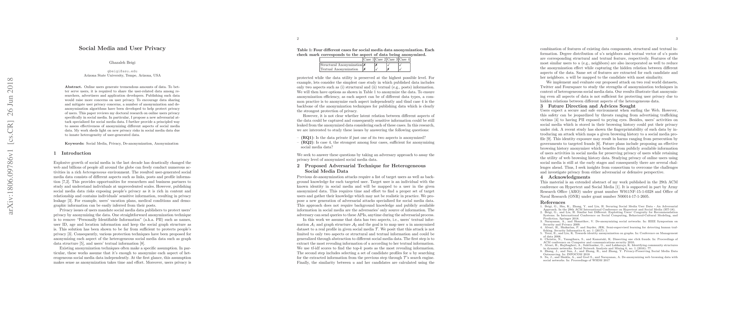 Online users generate tremendous amounts of data. To better serve users, it is required to share the user-related data among researchers, advertisers and application developers. Publishing such data would raise more concerns on user privacy. To encourage data sharing and mitigate user privacy concerns, a number of anonymization and de-anonymization algorithms have been developed to help protect privacy of users. This paper reviews my doctoral research on online users privacy specifically in social media. In particular, I propose a new adversarial attack specialized for social media data. I further provide a principled way to assess effectiveness of anonymizing different aspects of social media data. My work sheds light on new privacy risks in social media data due to innate heterogeneity of user-generated data.
