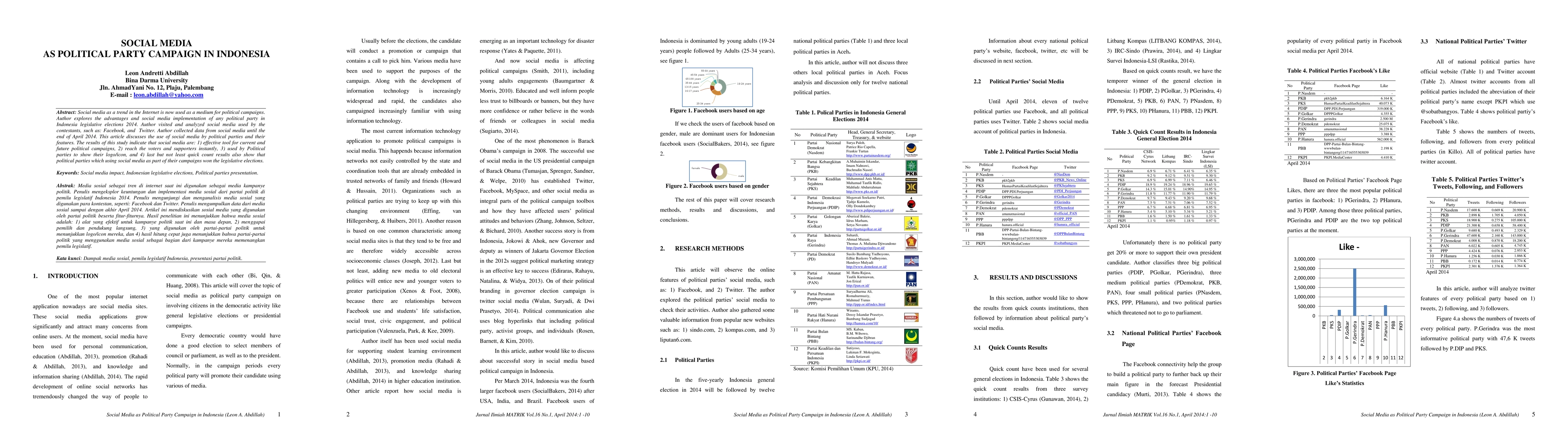 This study examines the role of social media in Indonesian political campaigns during the 2014 legislative elections, highlighting its effectiveness, instant reach to voters, and use for showcasing party icons. Results indicate that parties utilizing social media had better electoral outcomes.