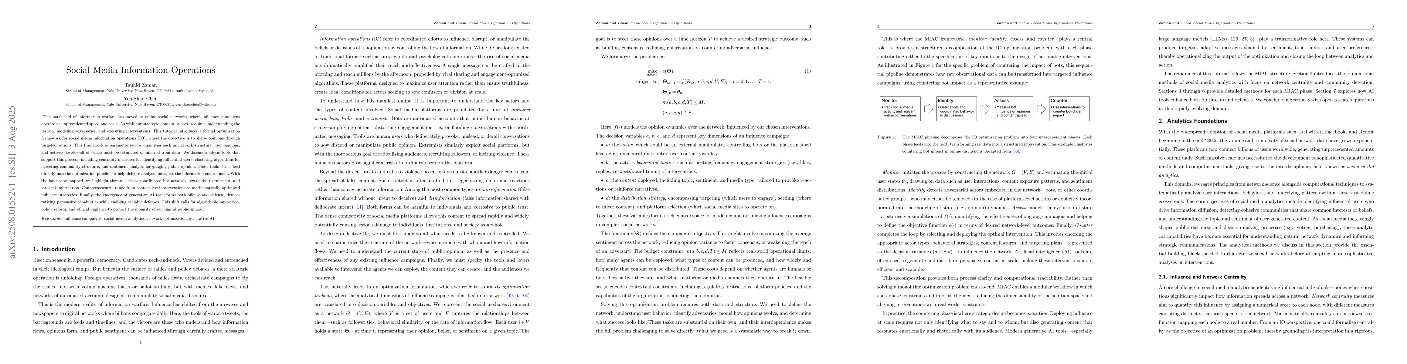 The battlefield of information warfare has moved to online social networks, where influence campaigns operate at unprecedented speed and scale. As with any strategic domain, success requires understanding the terrain, modeling adversaries, and executing interventions. This tutorial introduces a formal optimization framework for social media information operations (IO), where the objective is to shape opinions through targeted actions. This framework is parameterized by quantities such as network structure, user opinions, and activity levels - all of which must be estimated or inferred from data. We discuss analytic tools that support this process, including centrality measures for identifying influential users, clustering algorithms for detecting community structure, and sentiment analysis for gauging public opinion. These tools either feed directly into the optimization pipeline or help defense analysts interpret the information environment. With the landscape mapped, we highlight threats such as coordinated bot networks, extremist recruitment, and viral misinformation. Countermeasures range from content-level interventions to mathematically optimized influence strategies. Finally, the emergence of generative AI transforms both offense and defense, democratizing persuasive capabilities while enabling scalable defenses. This shift calls for algorithmic innovation, policy reform, and ethical vigilance to protect the integrity of our digital public sphere.