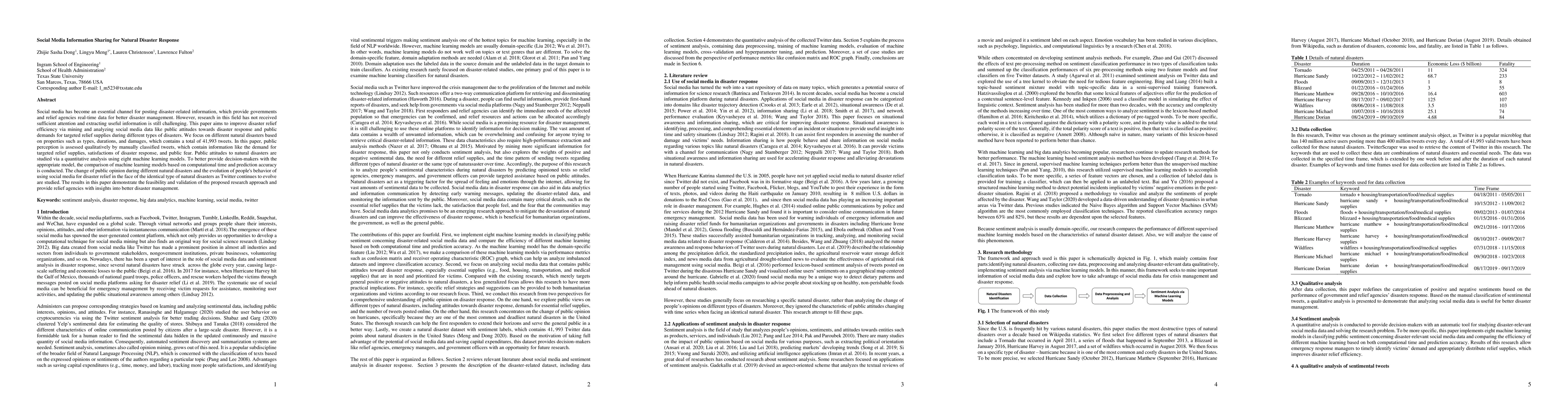 This paper explores the use of social media data to enhance natural disaster response efficiency by analyzing public attitudes and demands through machine learning models. The study assesses public perception via qualitative and quantitative methods on 41,993 tweets, demonstrating the effectiveness of the proposed approach for improved disaster management.