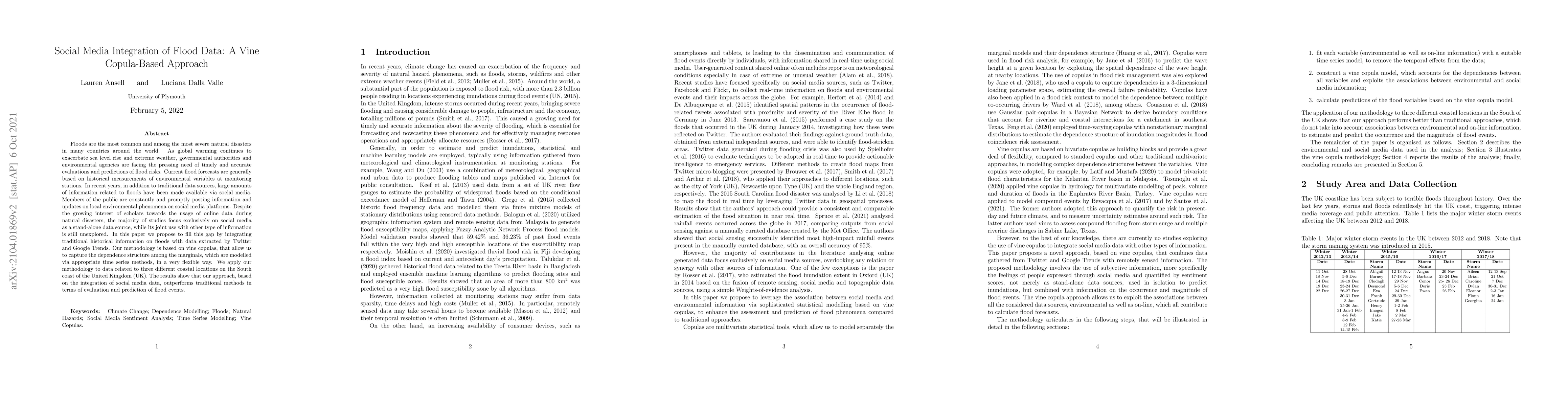 This paper proposes a vine copula-based approach to integrate traditional flood data with social media information from Twitter and Google Trends to improve flood risk evaluation and prediction. The results demonstrate that this integrated method outperforms traditional methods in forecasting flood events.