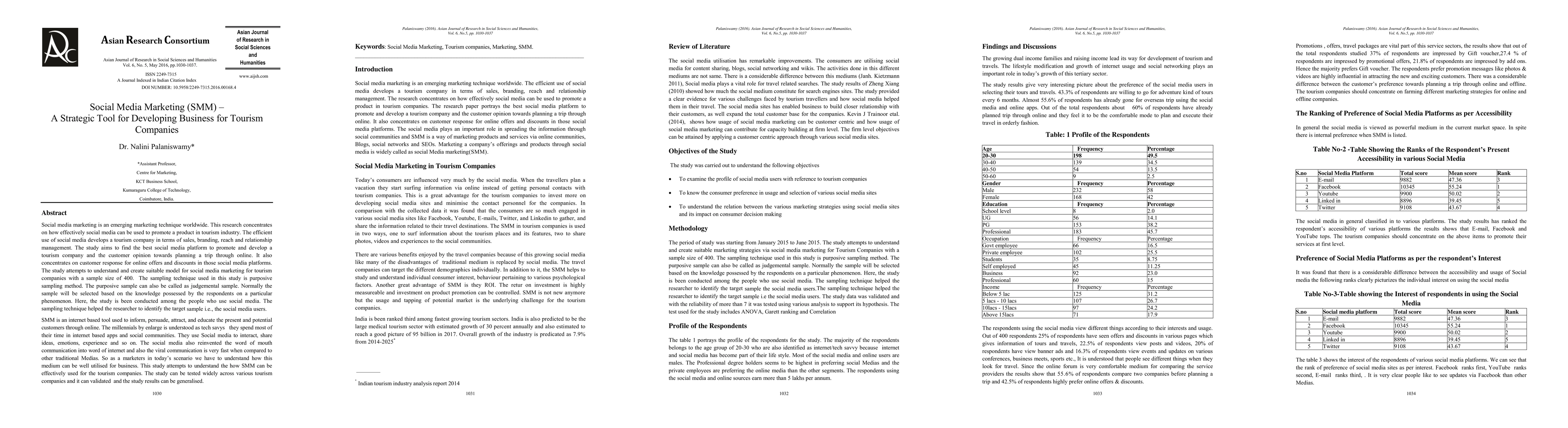 Social media marketing is an emerging marketing technique worldwide. This research concentrates on how effectively social media can be used to promote a product in tourism industry. The efficient use of social media develops a tourism company in terms of sales, branding, reach and relationship management. The study aims to find the best social media platform to promote and develop a tourism company and the customer opinion towards planning a trip through online. It also concentrates on customer response for online offers and discounts in those social media platforms. The study attempts to understand and create suitable model for social media marketing for tourism companies with a sample size of 400. The sampling technique used in this study is purposive sampling method. The purposive sample can also be called as judgemental sample. Normally the sample will be selected based on the knowledge possessed by the respondents on a particular phenomenon. Here, the study is been conducted among the people who use social media. The sampling technique helped the researcher to identify the target sample i.e., the social media users.