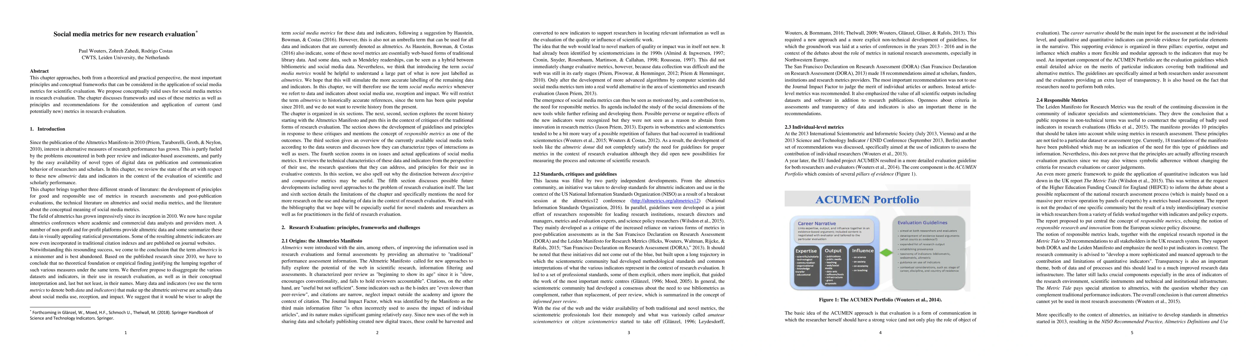 This chapter approaches, both from a theoretical and practical perspective, the most important principles and conceptual frameworks that can be considered in the application of social media metrics for scientific evaluation. We propose conceptually valid uses for social media metrics in research evaluation. The chapter discusses frameworks and uses of these metrics as well as principles and recommendations for the consideration and application of current (and potentially new) metrics in research evaluation.