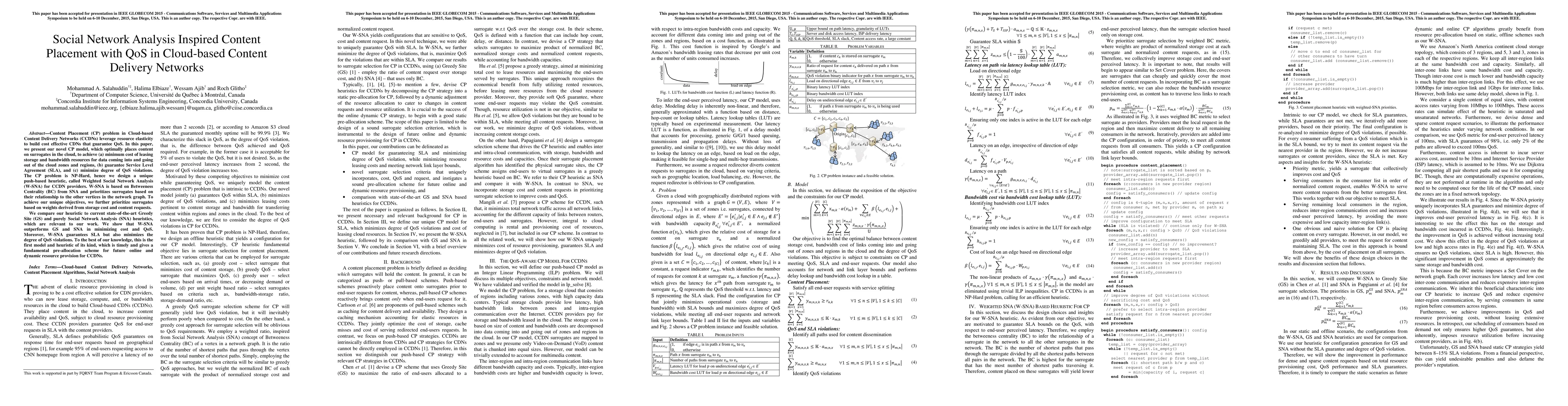 This paper introduces a novel Content Placement model for Cloud-based Content Delivery Networks (CCDNs) that uses a Weighted Social Network Analysis (W-SNA) heuristic to optimize storage and bandwidth costs while guaranteeing Service Level Agreements (SLAs) and minimizing QoS violations. The W-SNA heuristic outperforms existing Greedy Site and Social Network Analysis methods in cost and QoS efficiency.