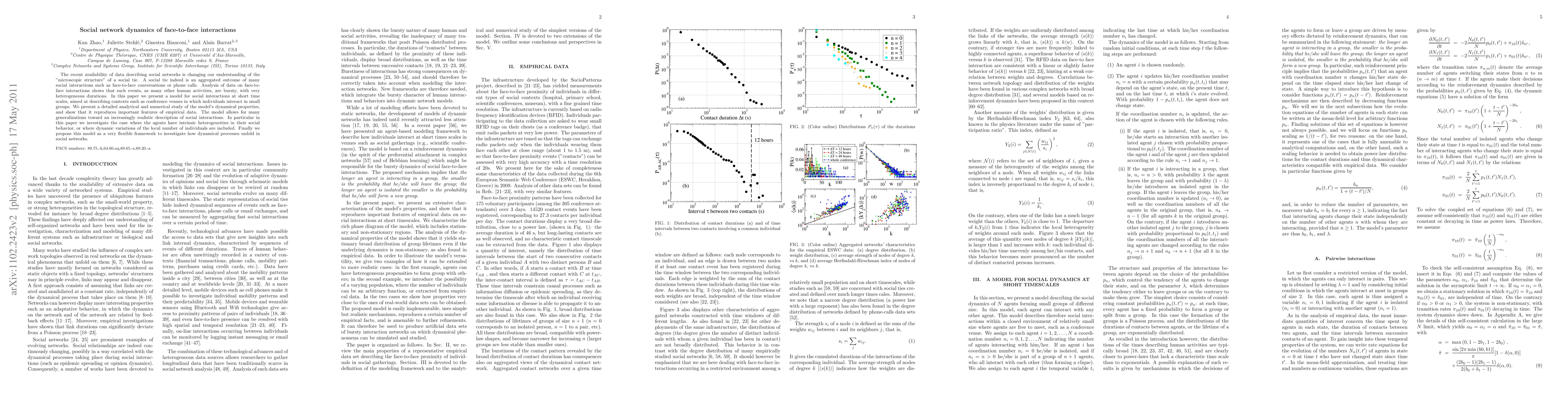 The recent availability of data describing social networks is changing our understanding of the "microscopic structure" of a social tie. A social tie indeed is an aggregated outcome of many social interactions such as face-to-face conversations or phone-calls. Analysis of data on face-to-face interactions shows that such events, as many other human activities, are bursty, with very heterogeneous durations. In this paper we present a model for social interactions at short time scales, aimed at describing contexts such as conference venues in which individuals interact in small groups. We present a detailed anayltical and numerical study of the model's dynamical properties, and show that it reproduces important features of empirical data. The model allows for many generalizations toward an increasingly realistic description of social interactions. In particular in this paper we investigate the case where the agents have intrinsic heterogeneities in their social behavior, or where dynamic variations of the local number of individuals are included. Finally we propose this model as a very flexible framework to investigate how dynamical processes unfold in social networks.