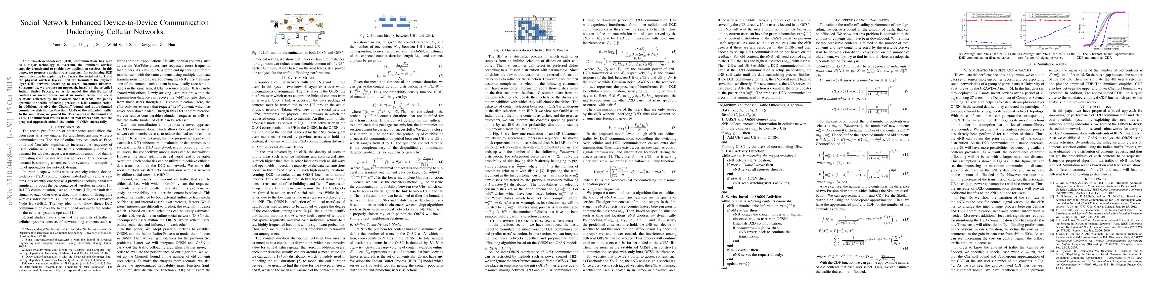 Device-to-device (D2D) communication has seen as a major technology to overcome the imminent wireless capacity crunch and to enable new application services. In this paper, we propose a social-aware approach for optimizing D2D communication by exploiting two layers: the social network and the physical wireless layers. First we formulate the physical layer D2D network according to users' encounter histories. Subsequently, we propose an approach, based on the so-called Indian Buffet Process, so as to model the distribution of contents in users' online social networks. Given the social relations collected by the Evolved Node B (eNB), we jointly optimize the traffic offloading process in D2D communication. In addition, we give the Chernoff bound and approximated cumulative distribution function (CDF) of the offloaded traffic. In the simulation, we proved the effectiveness of the bound and CDF. The numerical results based on real traces show that the proposed approach offload the traffic of eNB's successfully.