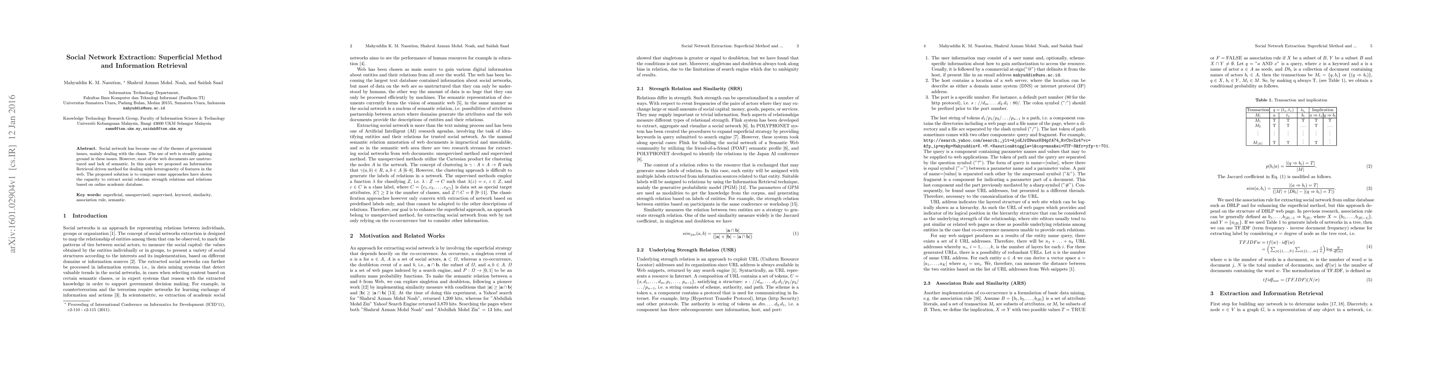 Summary: This paper proposes an Information Retrieval-driven method to extract social network relations from unstructured web documents, addressing the heterogeneity of web features. The approach demonstrates the potential to identify both strength relations and academic database-based connections.