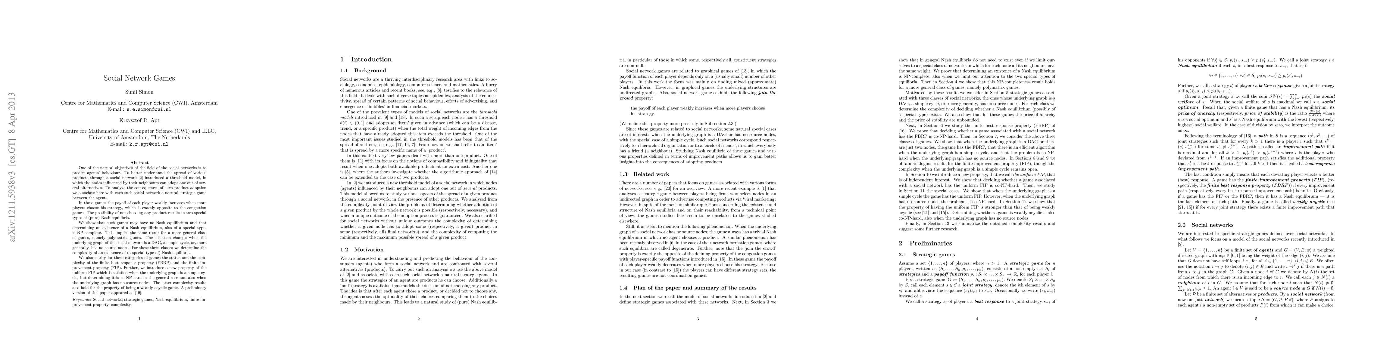 One of the natural objectives of the field of the social networks is to predict agents' behaviour. To better understand the spread of various products through a social network arXiv:1105.2434 introduced a threshold model, in which the nodes influenced by their neighbours can adopt one out of several alternatives. To analyze the consequences of such product adoption we associate here with each such social network a natural strategic game between the agents. In these games the payoff of each player weakly increases when more players choose his strategy, which is exactly opposite to the congestion games. The possibility of not choosing any product results in two special types of (pure) Nash equilibria. We show that such games may have no Nash equilibrium and that determining an existence of a Nash equilibrium, also of a special type, is NP-complete. This implies the same result for a more general class of games, namely polymatrix games. The situation changes when the underlying graph of the social network is a DAG, a simple cycle, or, more generally, has no source nodes. For these three classes we determine the complexity of an existence of (a special type of) Nash equilibria. We also clarify for these categories of games the status and the complexity of the finite best response property (FBRP) and the finite improvement property (FIP). Further, we introduce a new property of the uniform FIP which is satisfied when the underlying graph is a simple cycle, but determining it is co-NP-hard in the general case and also when the underlying graph has no source nodes. The latter complexity results also hold for the property of being a weakly acyclic game. A preliminary version of this paper appeared as [19].