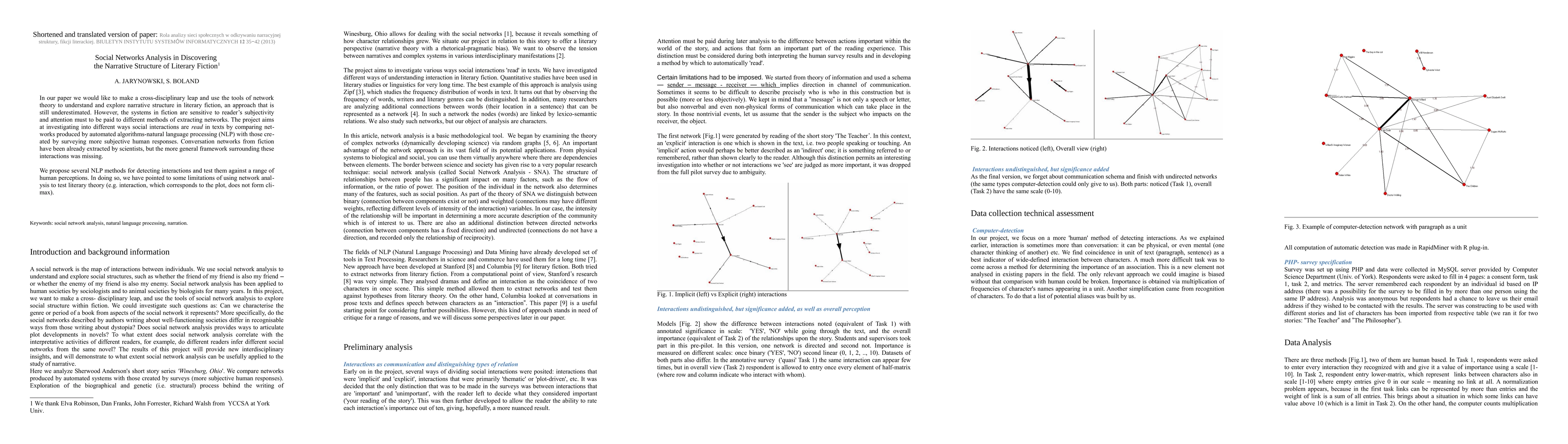 In our paper we would like to make a cross-disciplinary leap and use the tools of network theory to understand and explore narrative structure in literary fiction, an approach that is still underestimated. However, the systems in fiction are sensitive to readers subjectivity and attention must to be paid to different methods of extracting networks. The project aims at investigating into different ways social interactions are read in texts by comparing networks produced by automated algorithms-natural language processing with those created by surveying more subjective human responses. Conversation networks from fiction have been already extracted by scientists, but the more general framework surrounding these interactions was missing. We propose several NLP methods for detecting interactions and test them against a range of human perceptions. In doing so, we have pointed to some limitations of using network analysis to test literary theory, e.g. interaction, which corresponds to the plot, does not form climax.