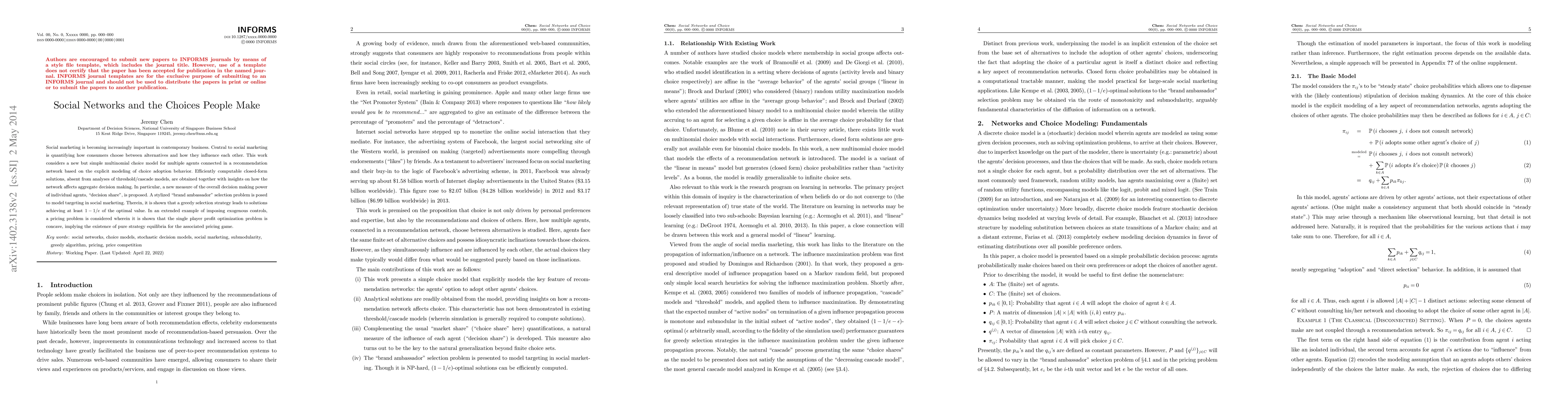 Social marketing is becoming increasingly important in contemporary business. Central to social marketing is quantifying how consumers choose between alternatives and how they influence each other. This work considers a new but simple multinomial choice model for multiple agents connected in a recommendation network based on the explicit modeling of choice adoption behavior. Efficiently computable closed-form solutions, absent from analyses of threshold/cascade models, are obtained together with insights on how the network affects aggregate decision making. A stylized "brand ambassador" selection problem is posed to model targeting in social marketing. Therein, it is shown that a greedy selection strategy leads to solutions achieving at least $1-1/e$ of the optimal value. In an extended example of imposing exogenous controls, a pricing problem is considered wherein it is shown that the single player profit optimization problem is concave, implying the existence of pure strategy equilibria for the associated pricing game.