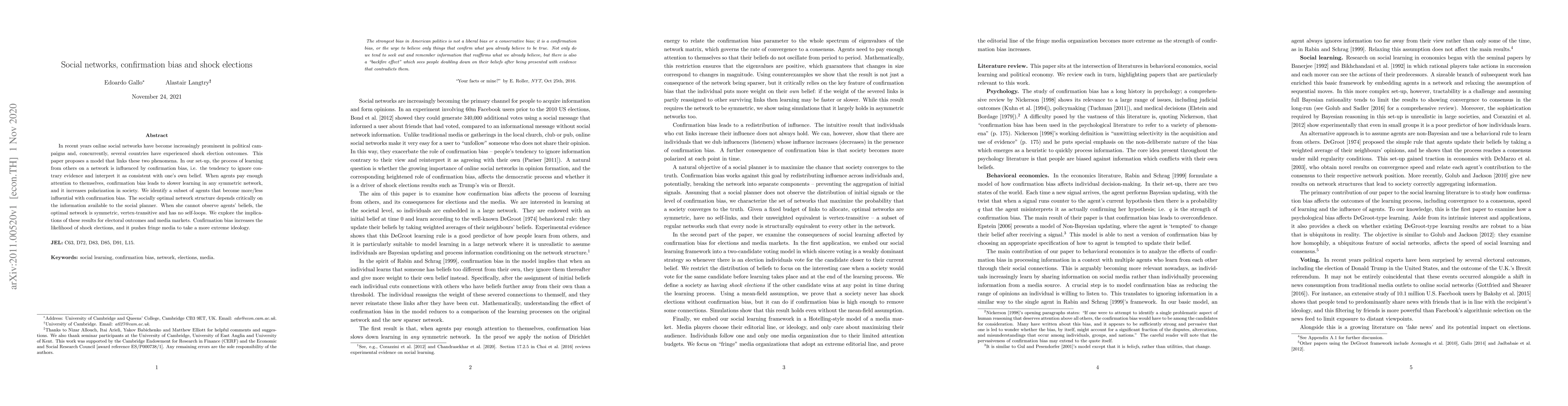A model shows how social networks can fuel shock elections through confirmation bias, leading to increased polarization and fringe media taking more extreme ideologies. The socially optimal network structure depends on available information and can influence electoral outcomes and media markets.