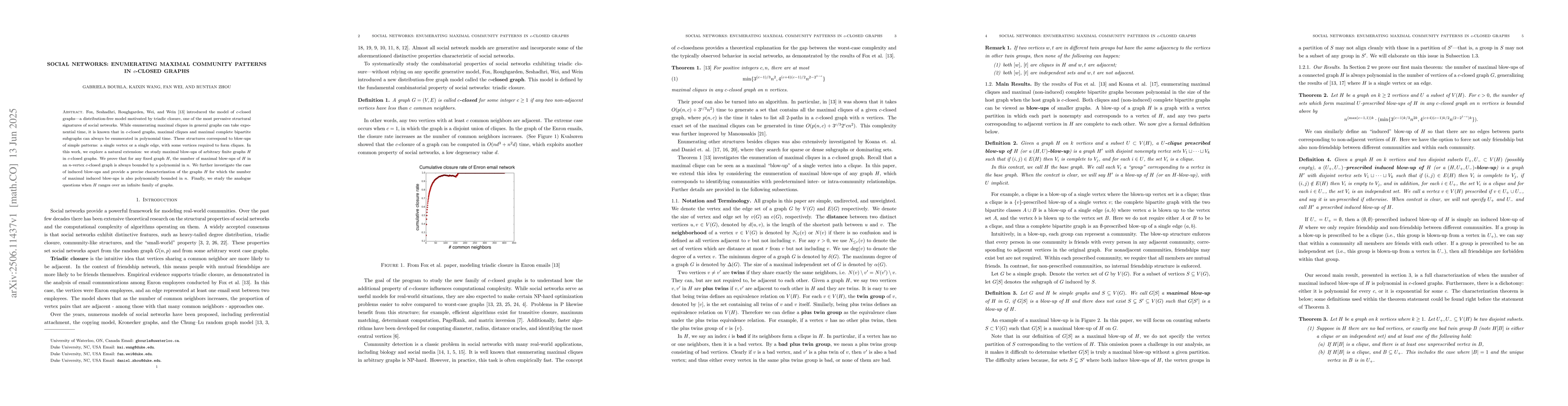 The extension of the $c$-closed graph model to include arbitrary finite graphs and the detailed analysis of maximal blow-ups contribute novel insights into community patterns in social networks, going beyond previous work that focused on simple patterns like single vertices or edges.