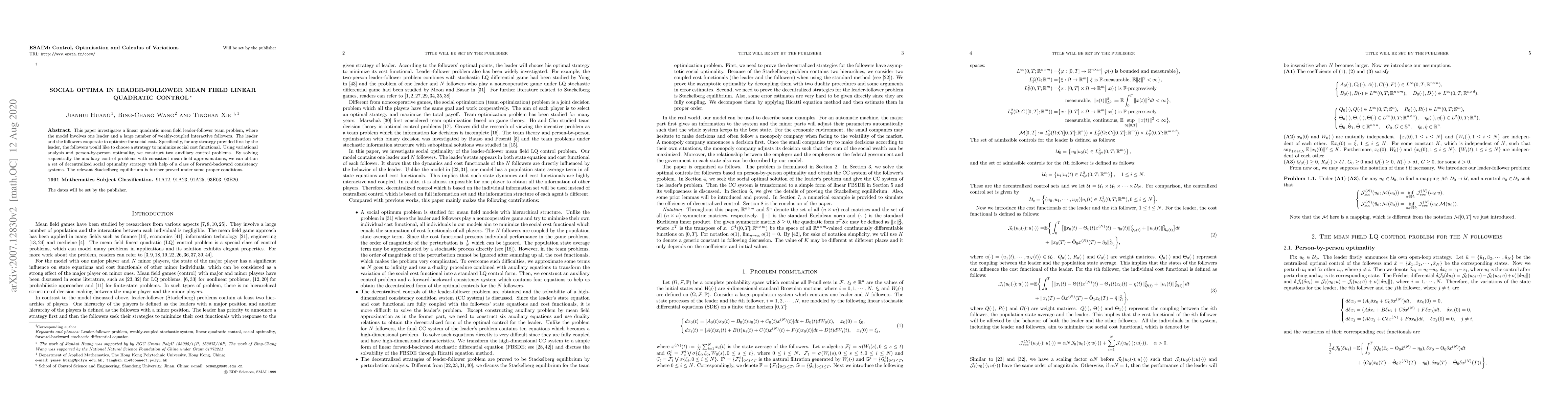 This paper explores a leader-follower mean field linear quadratic control problem with one leader and many followers, aiming to optimize social cost. It constructs auxiliary control problems and uses consistent mean field approximations to derive decentralized optimal strategies, proving the relevant Stackelberg equilibrium under certain conditions.