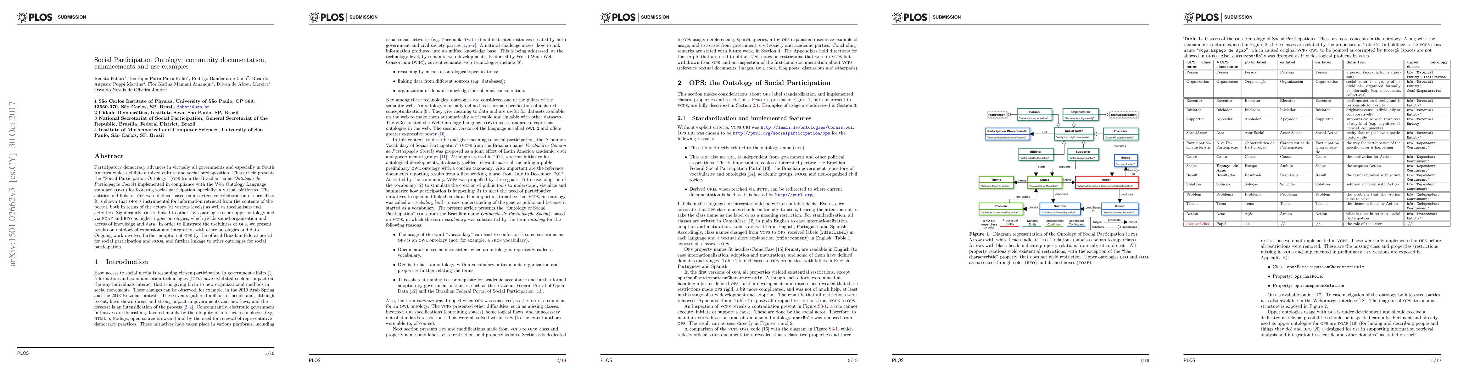 Participatory democracy advances in virtually all governments and especially in South America which exhibits a mixed culture and social predisposition. This article presents the "Social Participation Ontology" (OPS from the Brazilian name \emph{Ontologia de Participa\c{c}\~ao Social}) implemented in compliance with the Web Ontology Language standard (OWL) for fostering social participation, specially in virtual platforms. The entities and links of OPS were defined based on an extensive collaboration of specialists. It is shown that OPS is instrumental for information retrieval from the contents of the portal, both in terms of the actors (at various levels) as well as mechanisms and activities. Significantly, OPS is linked to other OWL ontologies as an upper ontology and via FOAF and BFO as higher upper ontologies, which yields sound organization and access of knowledge and data. In order to illustrate the usefulness of OPS, we present results on ontological expansion and integration with other ontologies and data. Ongoing work involves further adoption of OPS by the official Brazilian federal portal for social participation and NGO s, and further linkage to other ontologies for social participation.