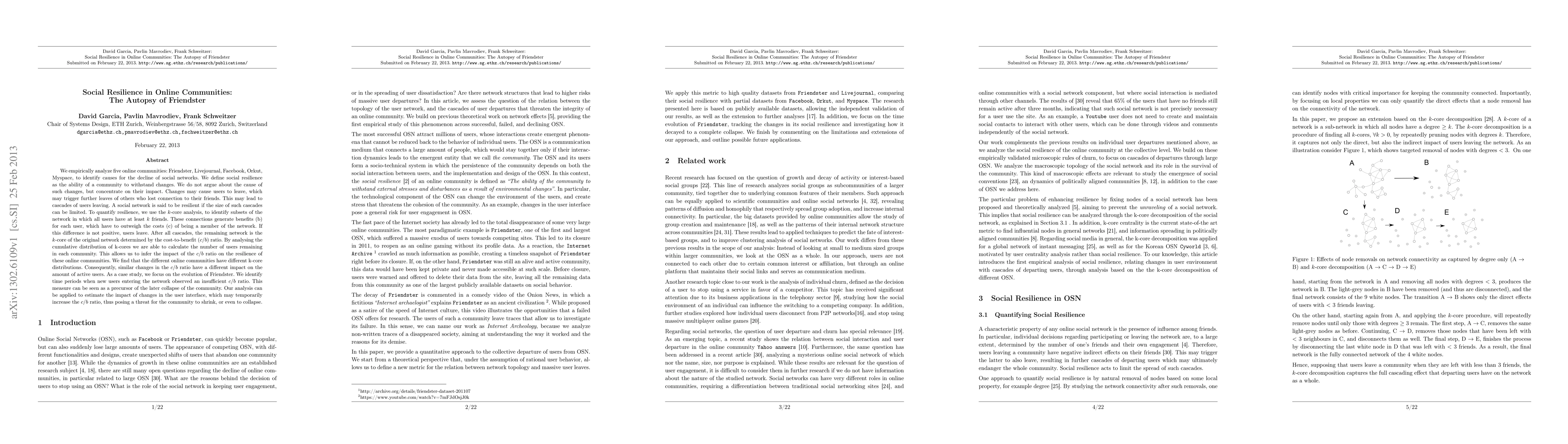 We empirically analyze five online communities: Friendster, Livejournal, Facebook, Orkut, Myspace, to identify causes for the decline of social networks. We define social resilience as the ability of a community to withstand changes. We do not argue about the cause of such changes, but concentrate on their impact. Changes may cause users to leave, which may trigger further leaves of others who lost connection to their friends. This may lead to cascades of users leaving. A social network is said to be resilient if the size of such cascades can be limited. To quantify resilience, we use the k-core analysis, to identify subsets of the network in which all users have at least k friends. These connections generate benefits (b) for each user, which have to outweigh the costs (c) of being a member of the network. If this difference is not positive, users leave. After all cascades, the remaining network is the k-core of the original network determined by the cost-to-benefit c/b ratio. By analysing the cumulative distribution of k-cores we are able to calculate the number of users remaining in each community. This allows us to infer the impact of the c/b ratio on the resilience of these online communities. We find that the different online communities have different k-core distributions. Consequently, similar changes in the c/b ratio have a different impact on the amount of active users. As a case study, we focus on the evolution of Friendster. We identify time periods when new users entering the network observed an insufficient c/b ratio. This measure can be seen as a precursor of the later collapse of the community. Our analysis can be applied to estimate the impact of changes in the user interface, which may temporarily increase the c/b ratio, thus posing a threat for the community to shrink, or even to collapse.